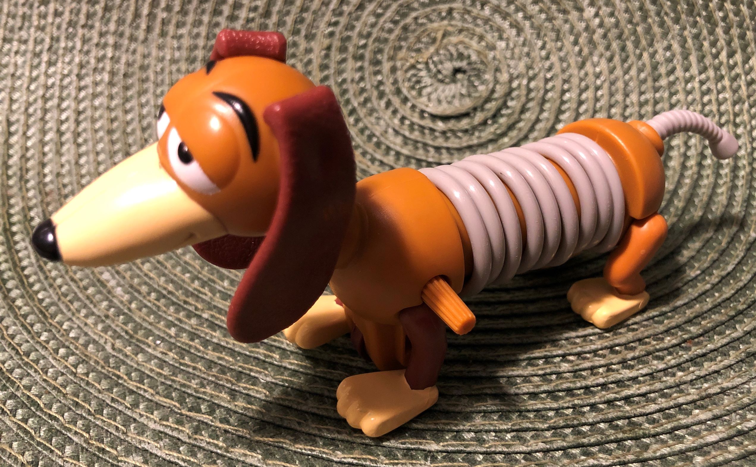 Slinky dog is a walker-type toy. You wind him up and he slowly moves across a surface. He is supposed to contract and expand as he does so, but this function is weak.