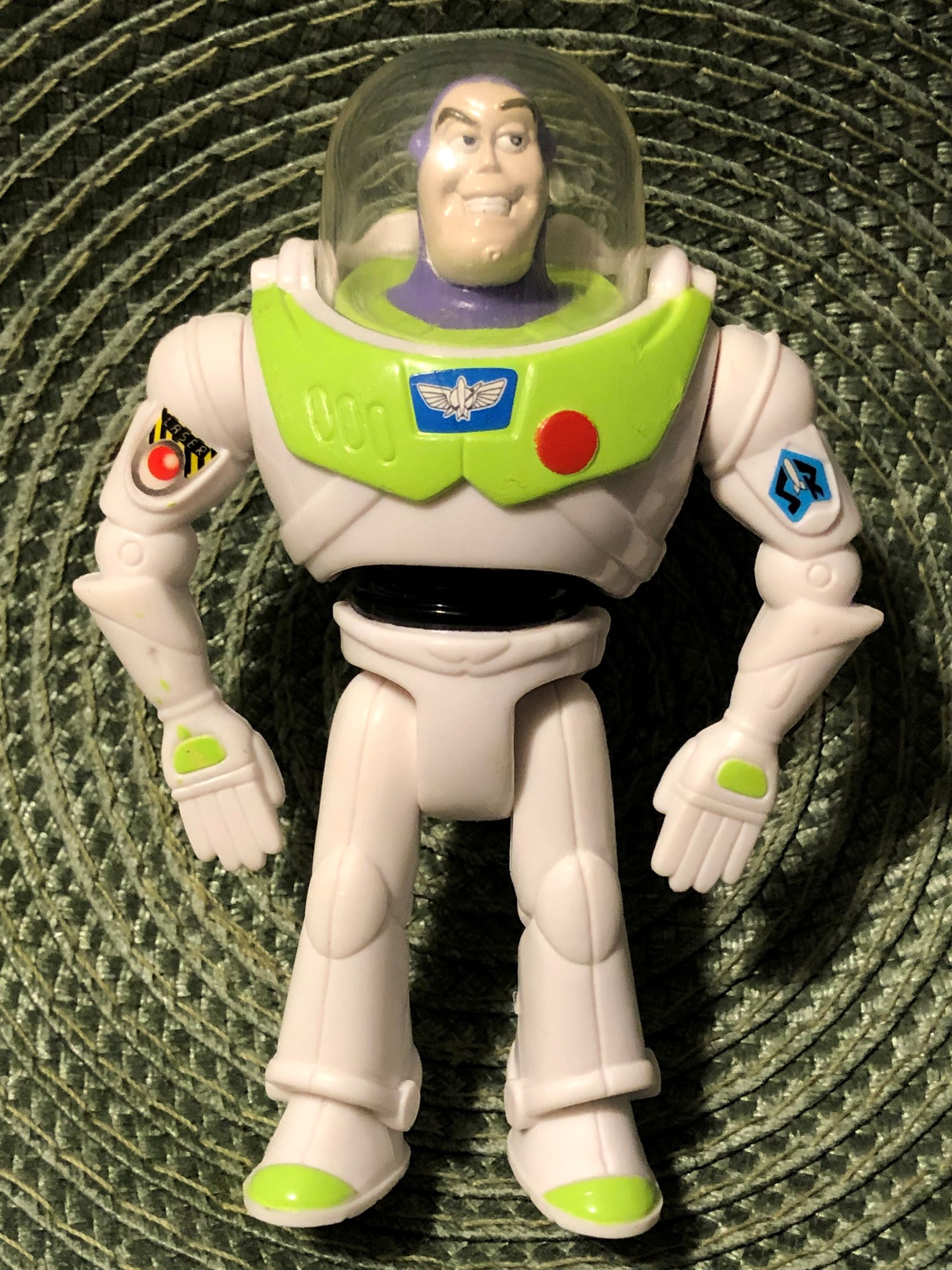 As mentioned in Part One, Buzz is one of the toys that has no action, so that is why he is not in the companion video. He is posable. And he also has 8 sounds that blast from his jet pack when you push a button. Unfortunately, due to the age of this toy, it no longer works. The batteries are no doubt dead and there is no way to change them. From research on the all-knowing Internet, I’ve found out that the noises are just beeps, chirps, and space-like sounds.