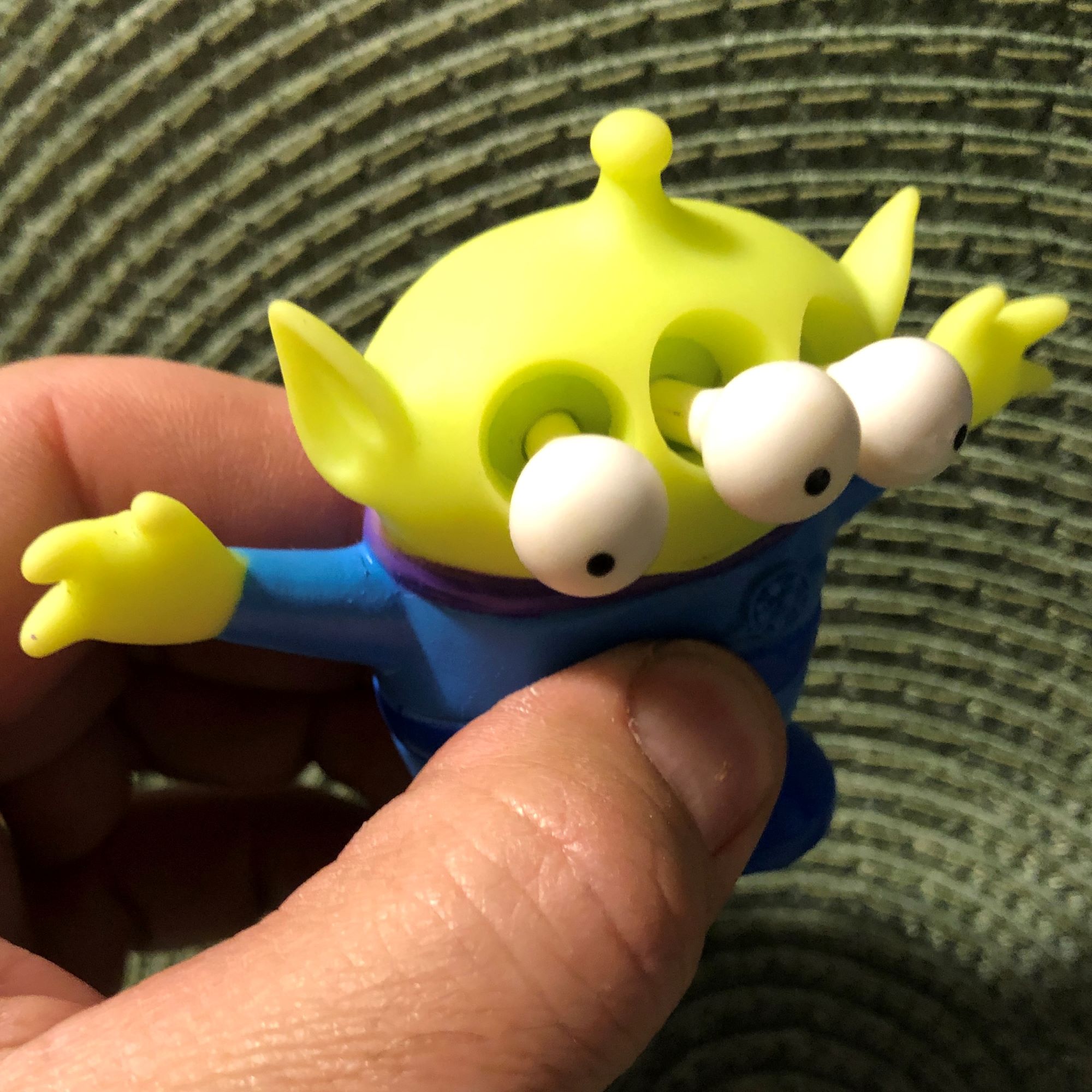 Oh. It’s just a LGM. This toy is the other one not included in the companion video. He has no action that needs to be seen live. But if you squeeze the little guy, all three of his eyes do ‘space out’, or bug out.
