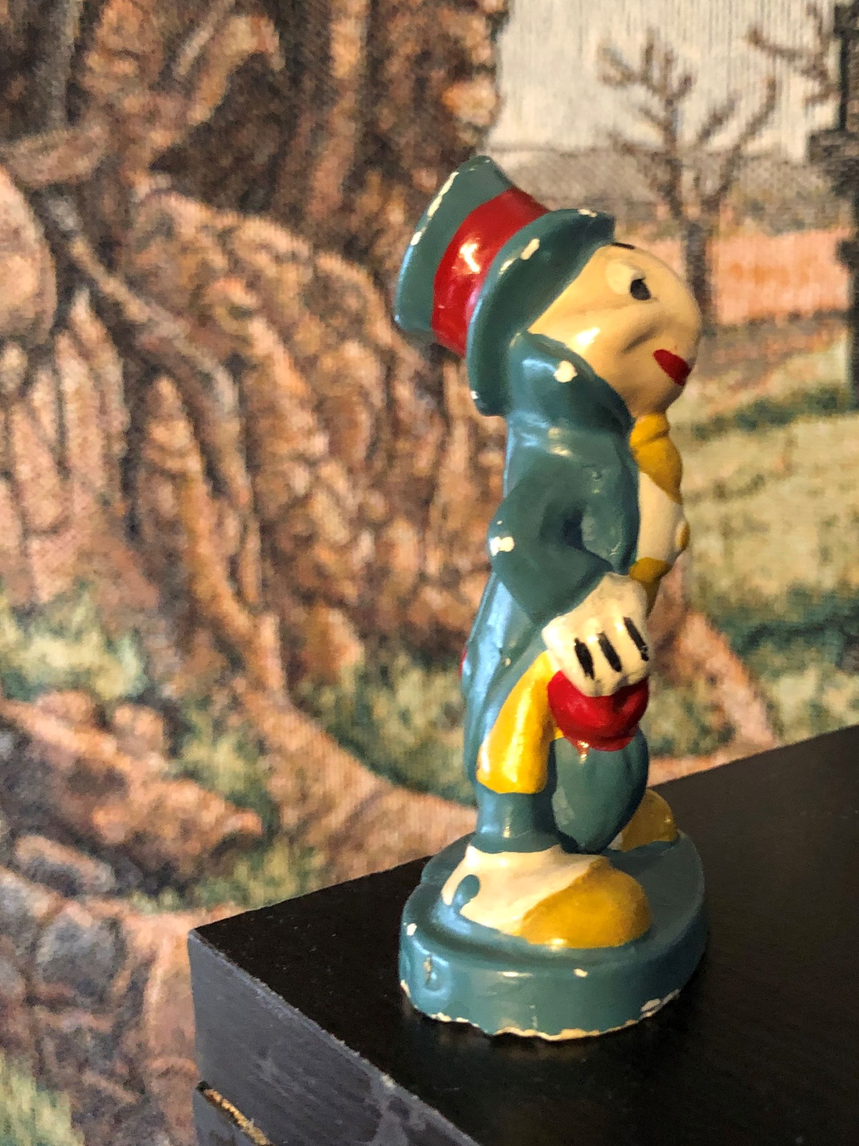 There are no manufacturer’s markings or copyright stamps. So it is pretty much impossible to date our little friend. Unless you turn out to be his type. As for the material it is made out of, it is either hard wax or some sort of chalk, as it is easily scratched. Jiminy is 3 1/4″ tall.