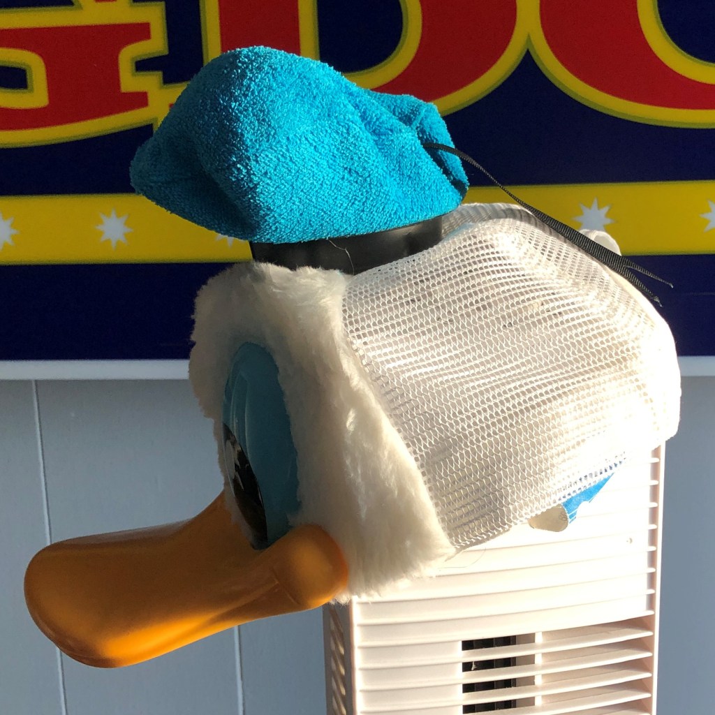 Donald looks a little freakier when you look inside the cap and see his eyes, or the back of his eyes, looking back at you! Spooky! This Dapper Drake’s chapeau was released as part of the Disney Character Fashions line. It could be from the 1980’s according to a bit of research done on the all-knowing Internet.