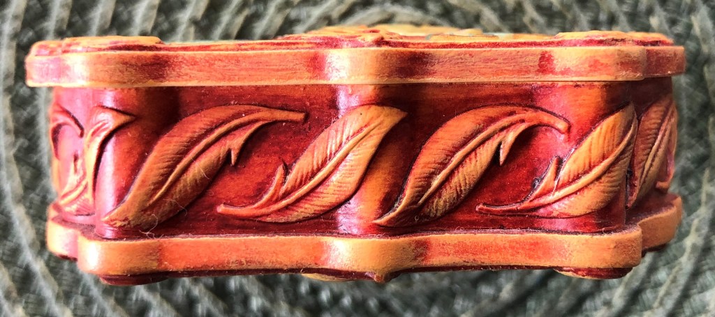 We bought these cute little keepsake boxes in Walt Disney World many years ago. I can’t remember the price but they weren’t too expensive. We liked the ornate carving on the front and were quite taken with the added detail on the backsides of each.