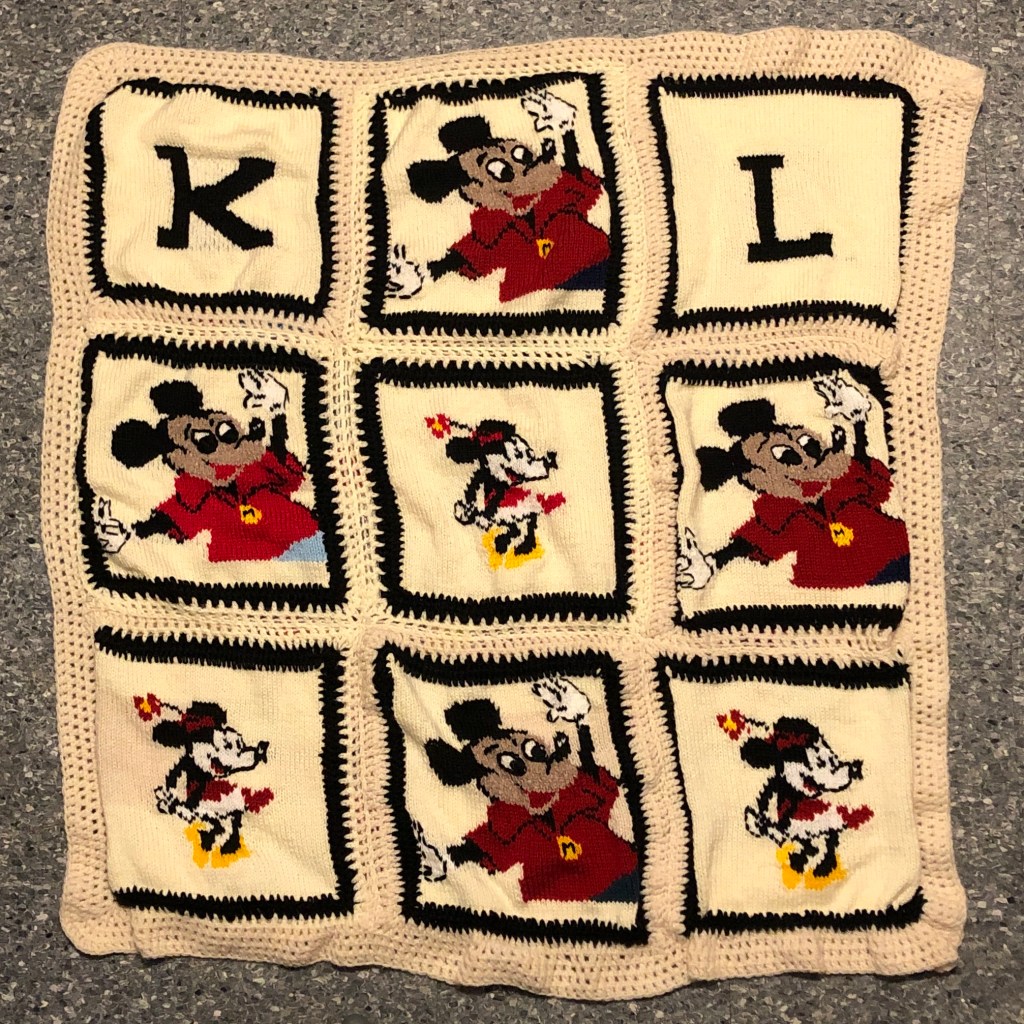 Apart from poetry, my mother also painted, did ballroom dancing, and knitted or crocheted. Many of our family have things she created. My wife and I are obviously big Disney fans, so she made us this: