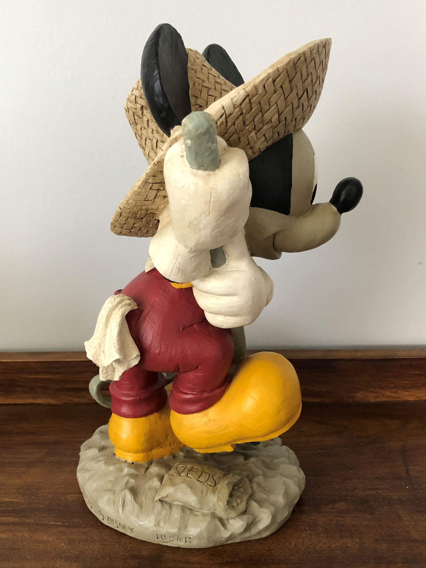 This Big Fig / Statuette / Statue/ Lawn Ornament / Garden Gnome (pick one) features Mickey in gardening attire, with a shovel, a watering can, and a bag of seeds.