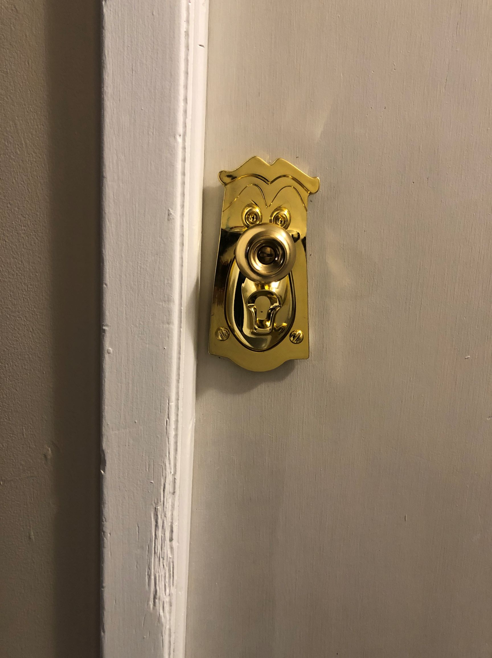 Test you Lock Set to ensure that the lock works, the knobs turn, and the tongue lines up with the strike plate in the door frame, just like your Lock Set always has. You can also see that due to the poor design of the product, it sits away from the door. So it looks good head on but not so much from the side. Also, you need to be careful when opening the door, because you can jostle the character ‘mouth’ piece. Over time, this may knock it loose or even off of the door completely.