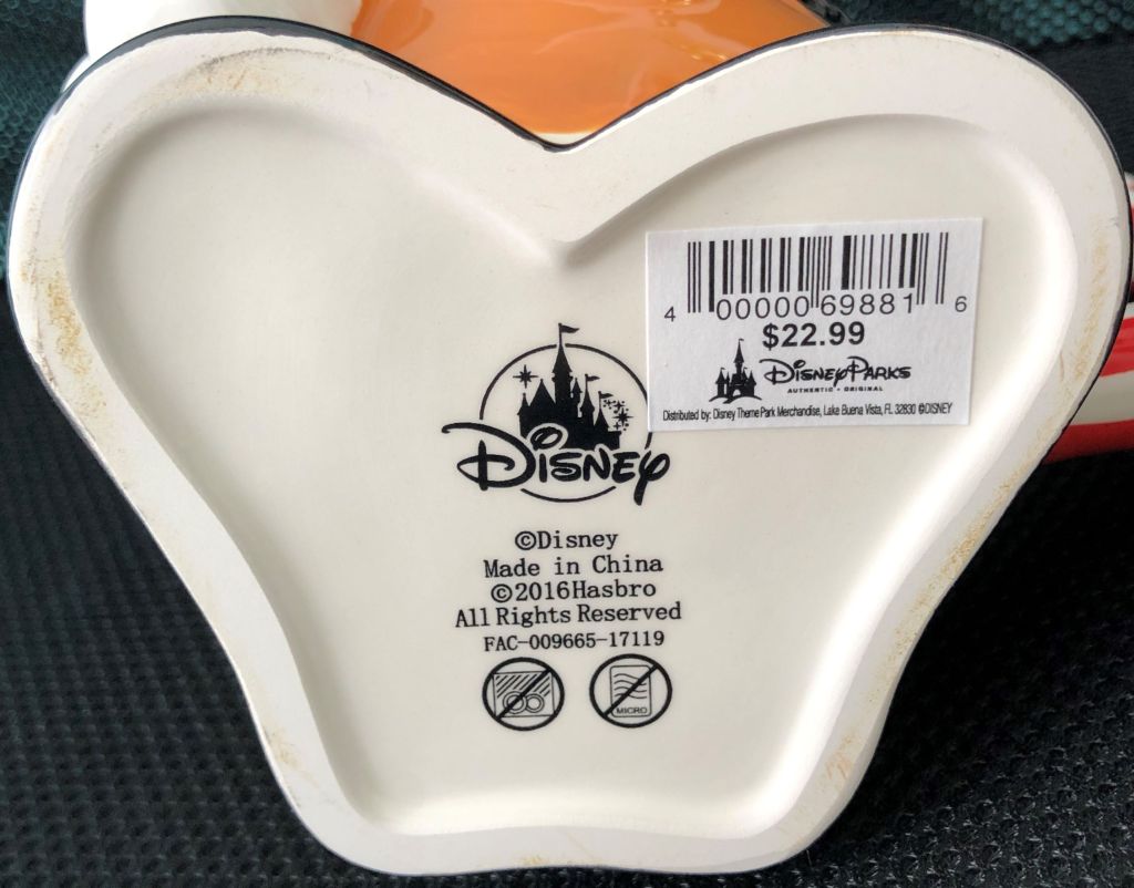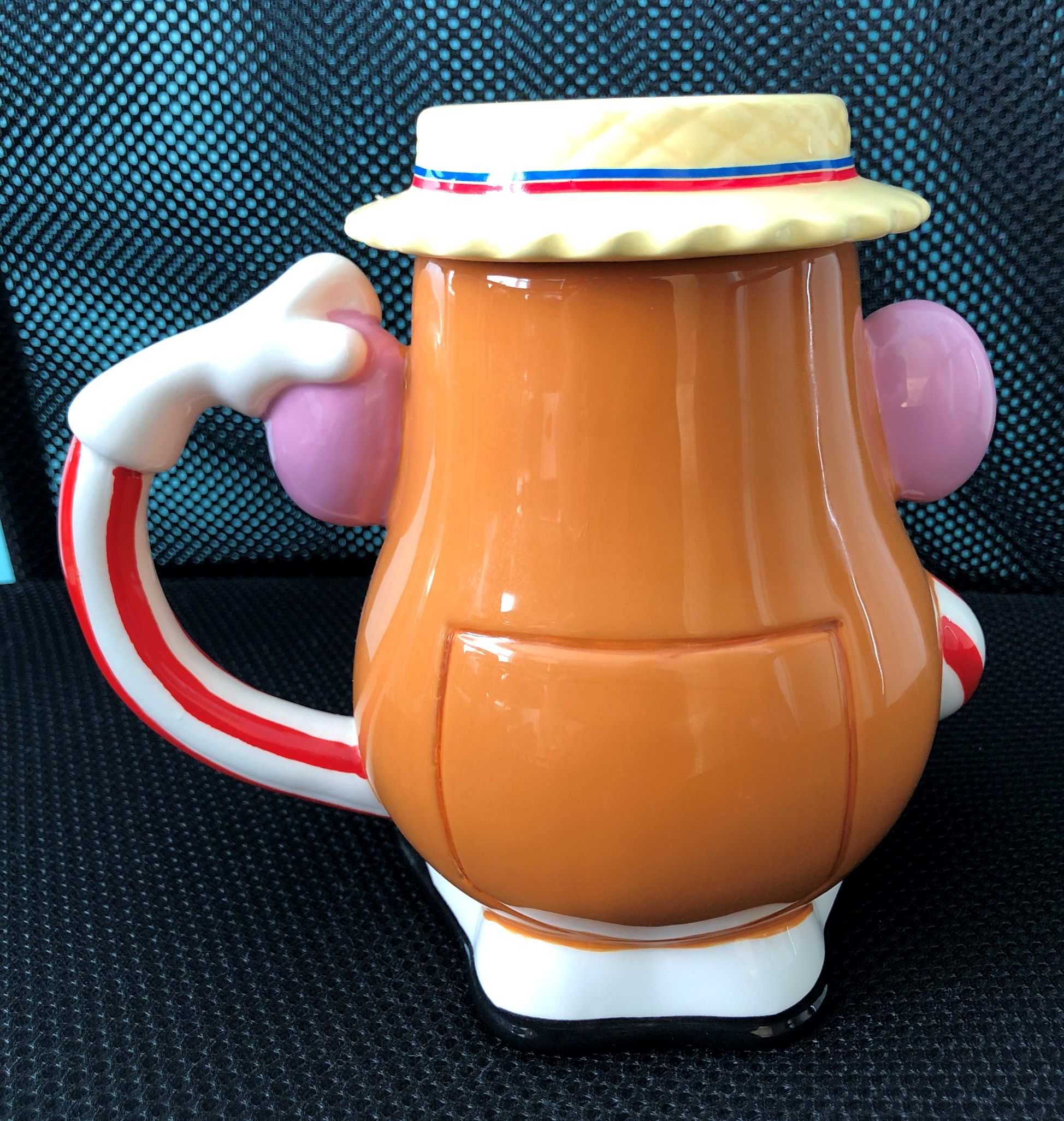 For just $22.99 I was able to purchase this fantastic drinking mug in the likeness of the Barker Potato! His hat is removable. This feature substitutes for the actual ability of the animatronic Barker Potato being able to remove his ear. That’s why his hand is on his ear forming the handle of the mug: it anticipates the removal of the ear.