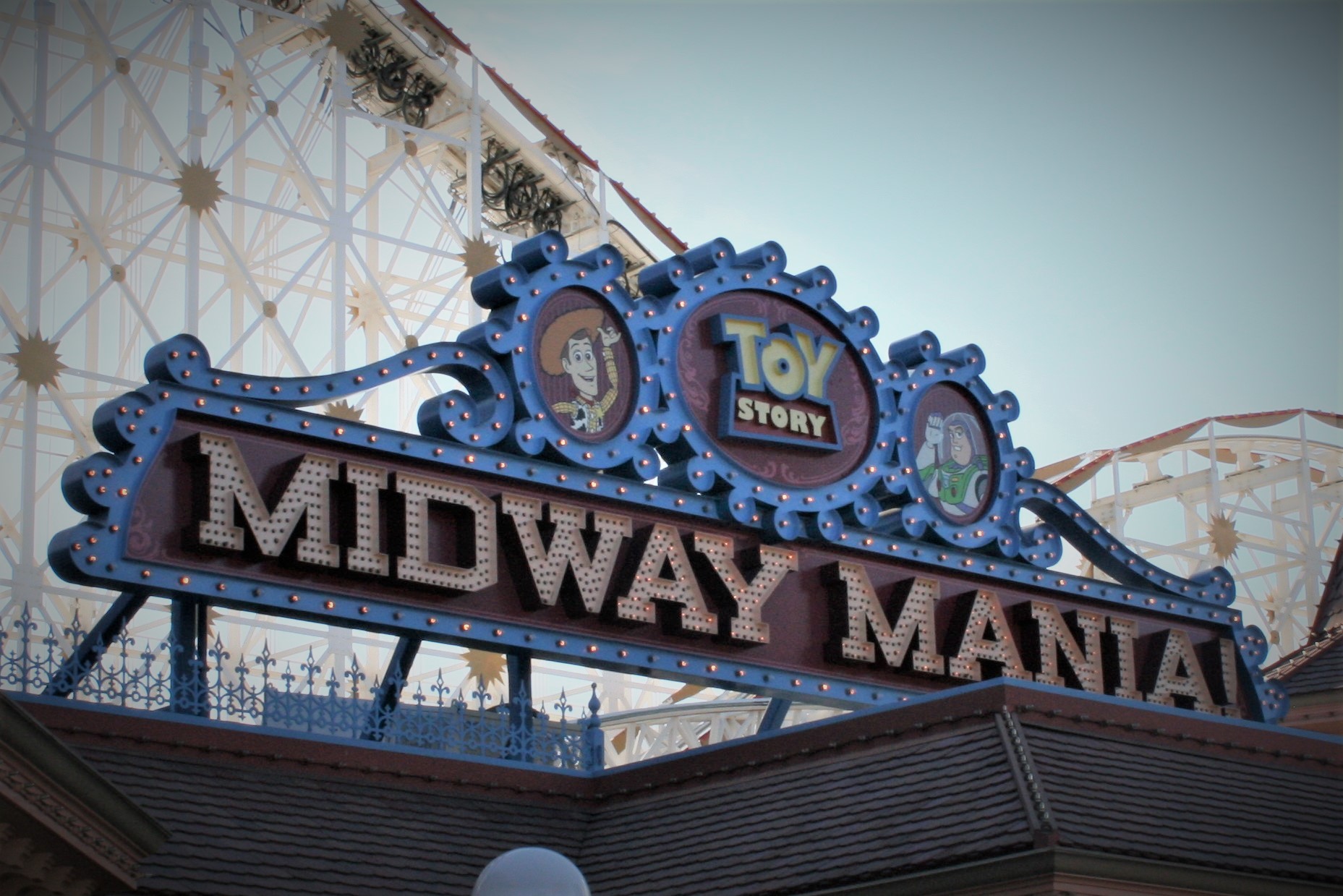 Toy Story Midway Mania is an interactive 4-D attraction, located at three different Disney Parks. The version I am featuring in this post is found in Disney’s California Adventure next to Disneyland. It was opened on June 17th of 2008. We rode it in 2013.