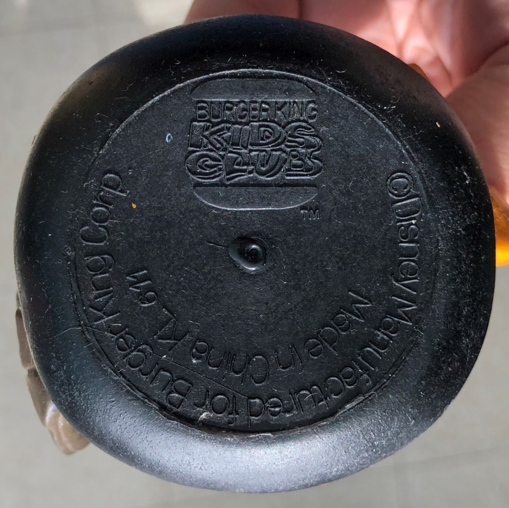 So we see that this was made by Disney Manufacturing for Burger King Corp in China. The Burger King Kids Club logo is also present.