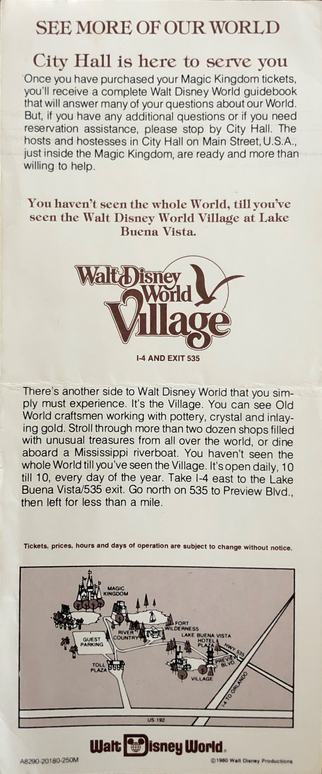 Many of the ticket packages included a complimentary ride over to the Village. And according to this pamphlet, ‘you simply must experience’ it! From Old World craftsmen, dozens of shops, and dining on a Mississippi riverboat (The Empress Lilly), ‘you haven’t seen the whole World till you’ve seen the Village’. Well, those 1980 people ain’t seen nuthin’ till they’ve seen today’s Disney Springs!