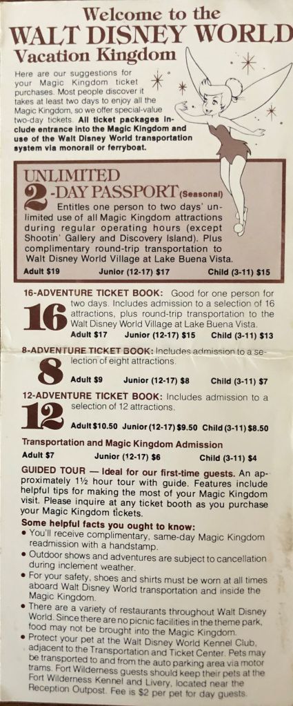 A quick visit to City Hall and you could pick up one of these handy pamphlets. It gave you everything you needed to know to buy your way into The Magic Kingdom. We are told that most people need at least two days to fully enjoy the Park. What packages are available? I’m glad you asked!