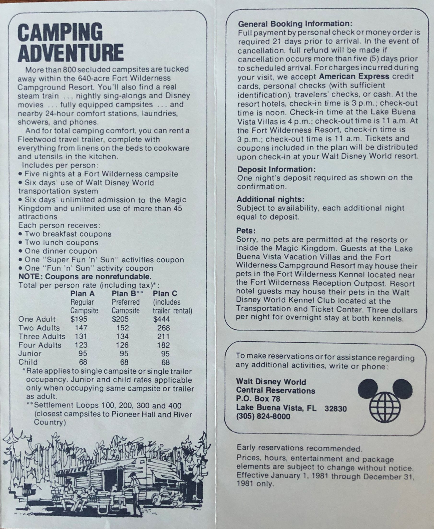Camping Adventure: You get 5 nights on a camp site or in a fully-equipped Fleetwood Travel Trailer, 6 days in the Magic Kingdom, those tasty food coupons, and the fun coupons as well. This will only set you back $195.00 US for one adult on a campsite or $444.00 US for the trailer. Either way, it’s a deal. And Fort Wilderness had its own Steam Train back then!