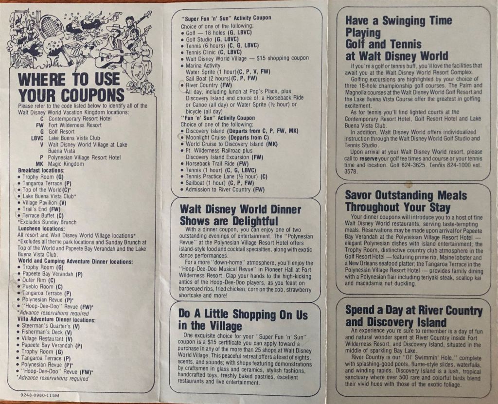 So we’ve briefly mentioned that each booking comes with fun coupons. But what do you do with those? You can enlarge the image above for a detailed accounting of the offerings available back then. From dinner shows to shopping, from golf and tennis to a water park or animal reserve, you had no shortage of places to redeem those little coupons of fun!