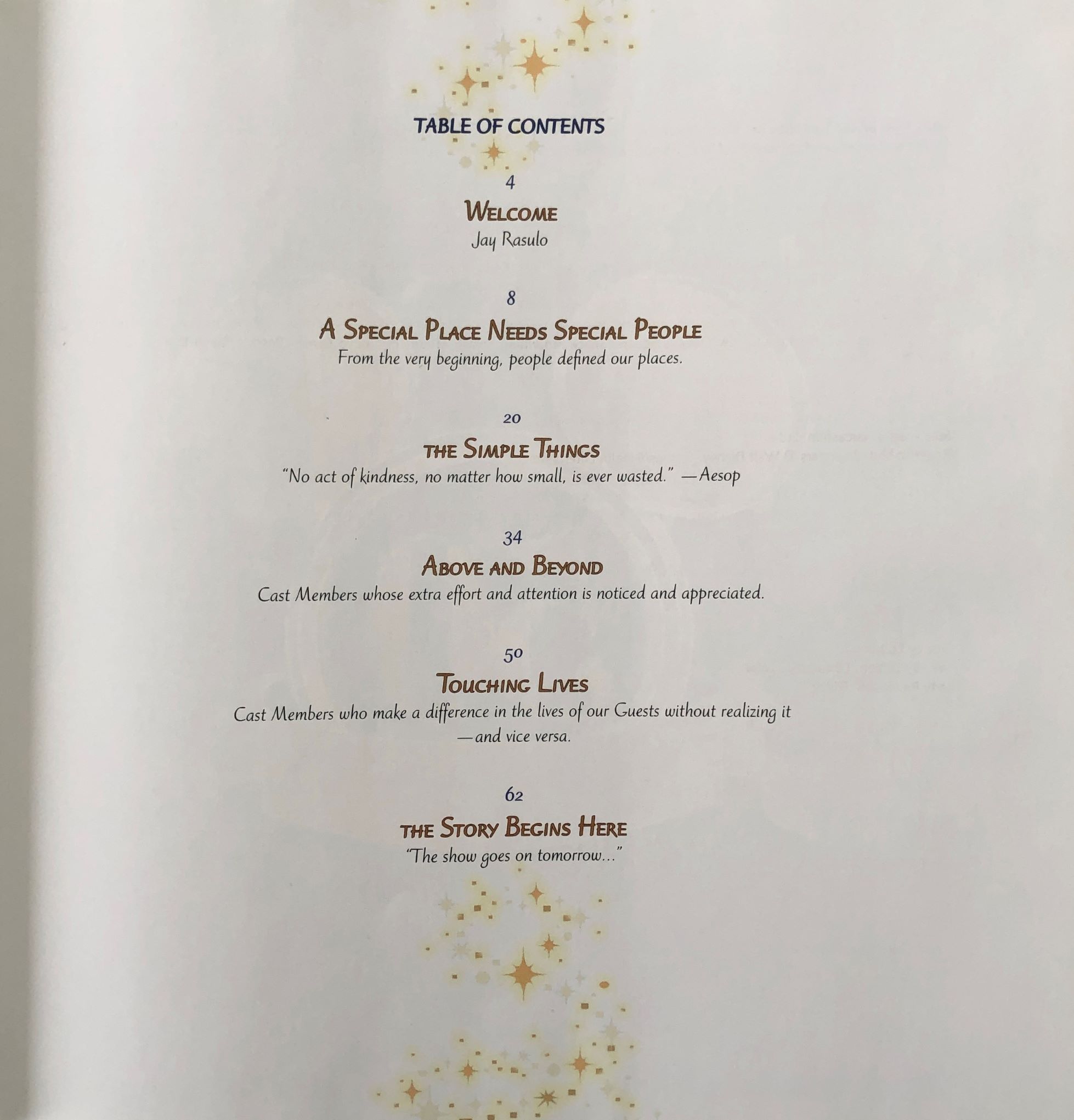 The contents page reveals the six sections of the book: A welcome from Jay Rasulo; a chapter highlighting the importance of people to the Disney experience; how simple things make a difference; how Disney goes above and beyond our expectations; letters and testimonials from guests about how Disney Cast Members touched their lives; and finally, a word about the future.