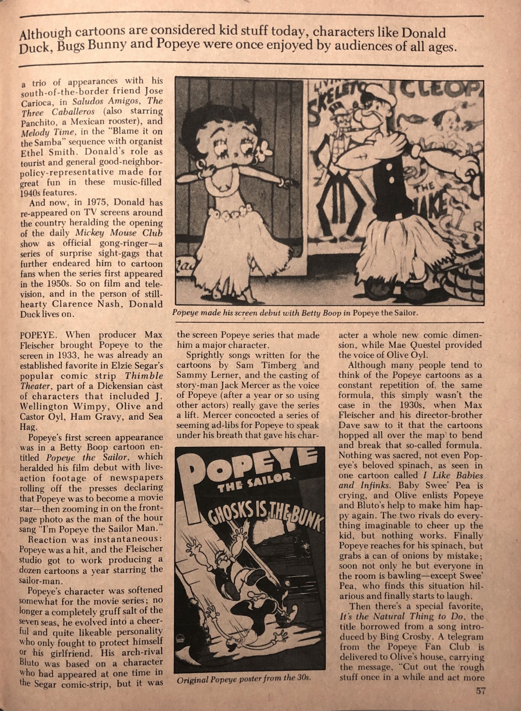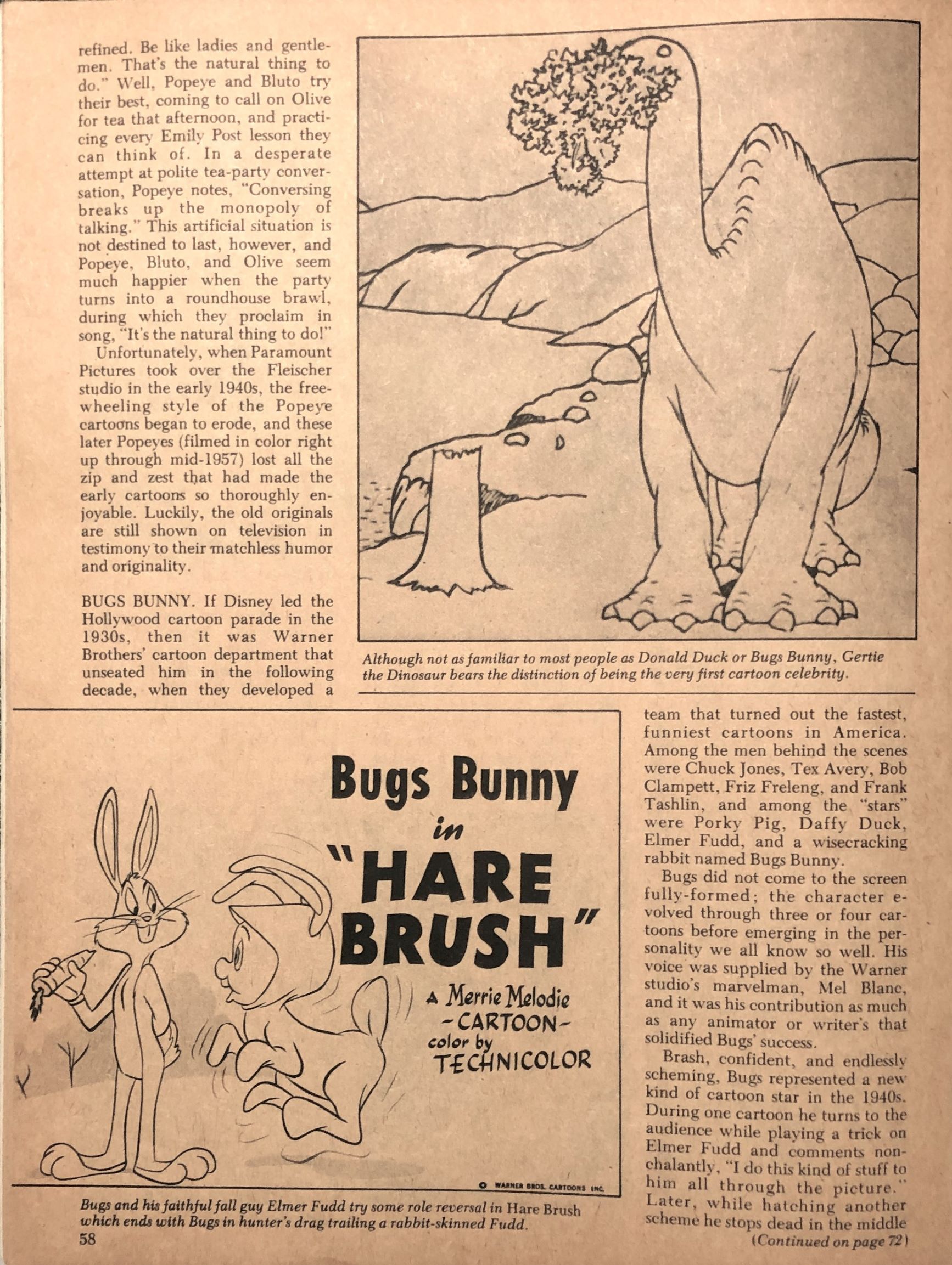 This old magazine certainly has that vintage aroma. And it’s pages are filled with such old time delights as Marlon Brando, movie posters, King Kong, Fatty Arbuckle (apparently not the nicest of guys), the politically incorrect Charlie Chan, and a touch of Star Trek and Wurlitzers. But what we’re going to focus on is found on page 55: Four Cartoon Favorites.