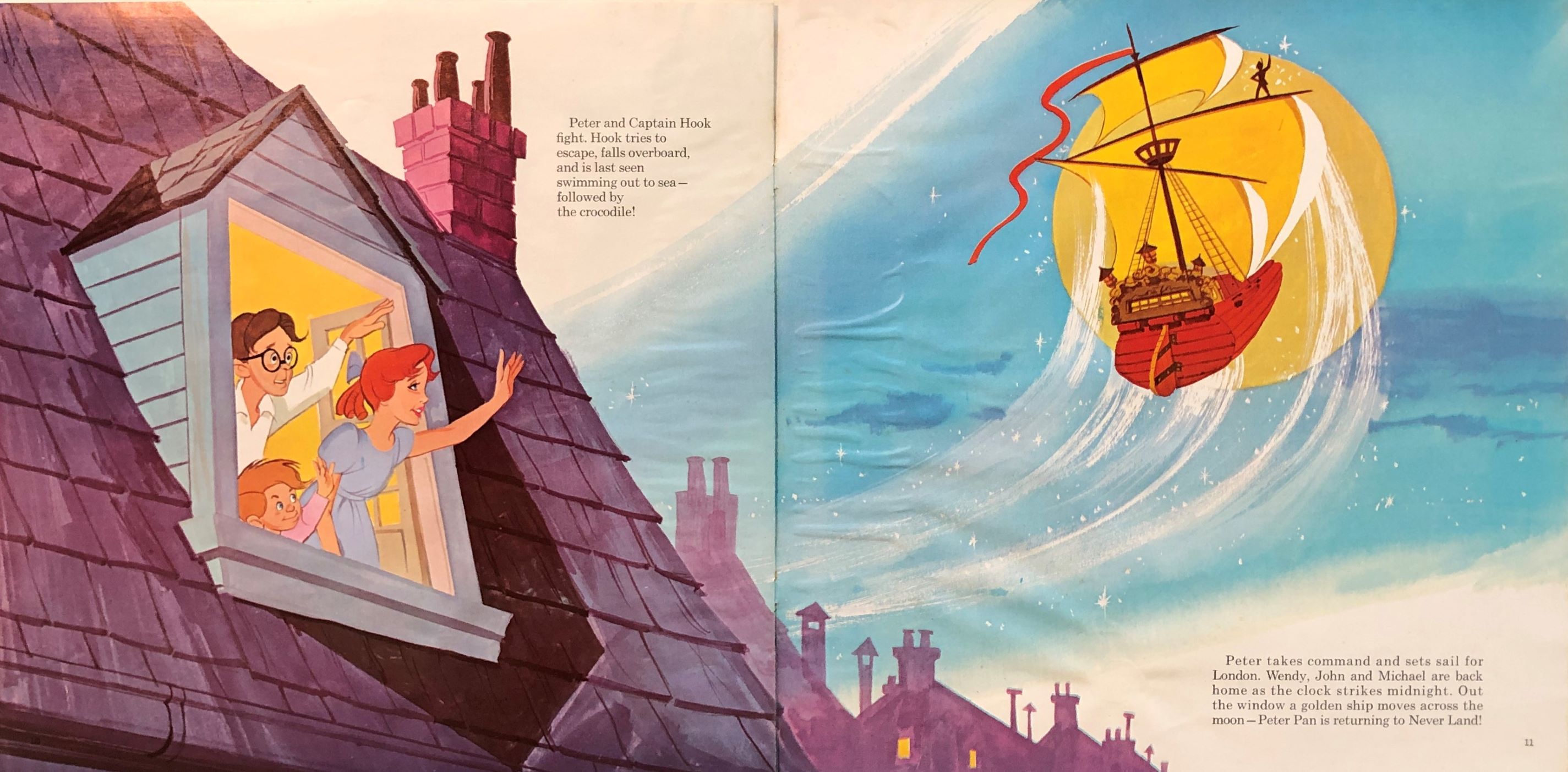 The last two-page spread (Pages 10 & 11) wrap up things with the children being returned safely home and Peter heading back to Neverland aboard the Jolly Roger.