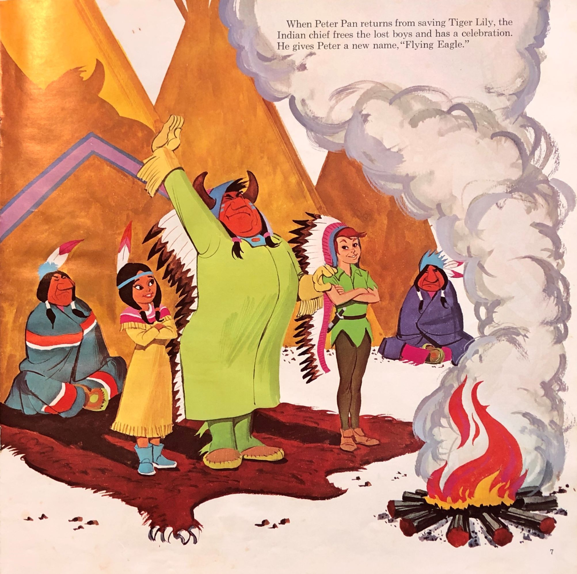 Yea! On Page 6 we see that Peter has won and the ol’ Captain must swim for his life, or give more of himself to the crocodile! Back at the Indian camp, Page 7 shows a celebration is being had with Peter honored with the new name of “Flying Eagle”.