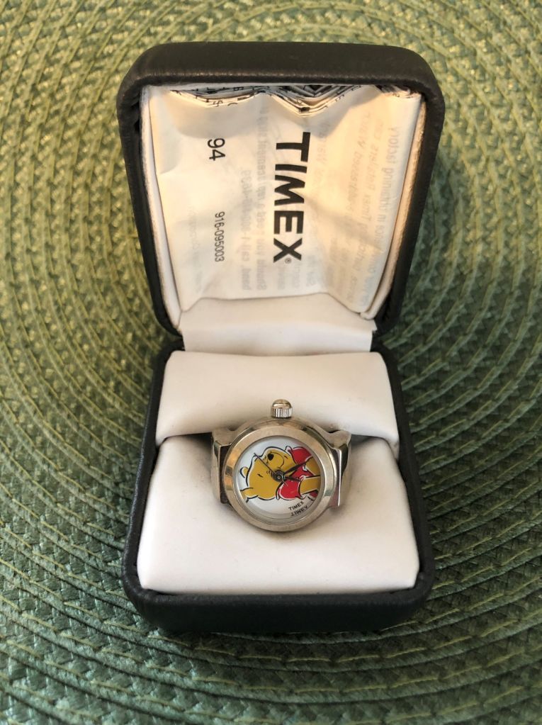 And who would be cuter on the face of such a small watch than Winnie the Pooh? That silly ol’ bear looks perfectly happy to watch the hands of time go around and around him!