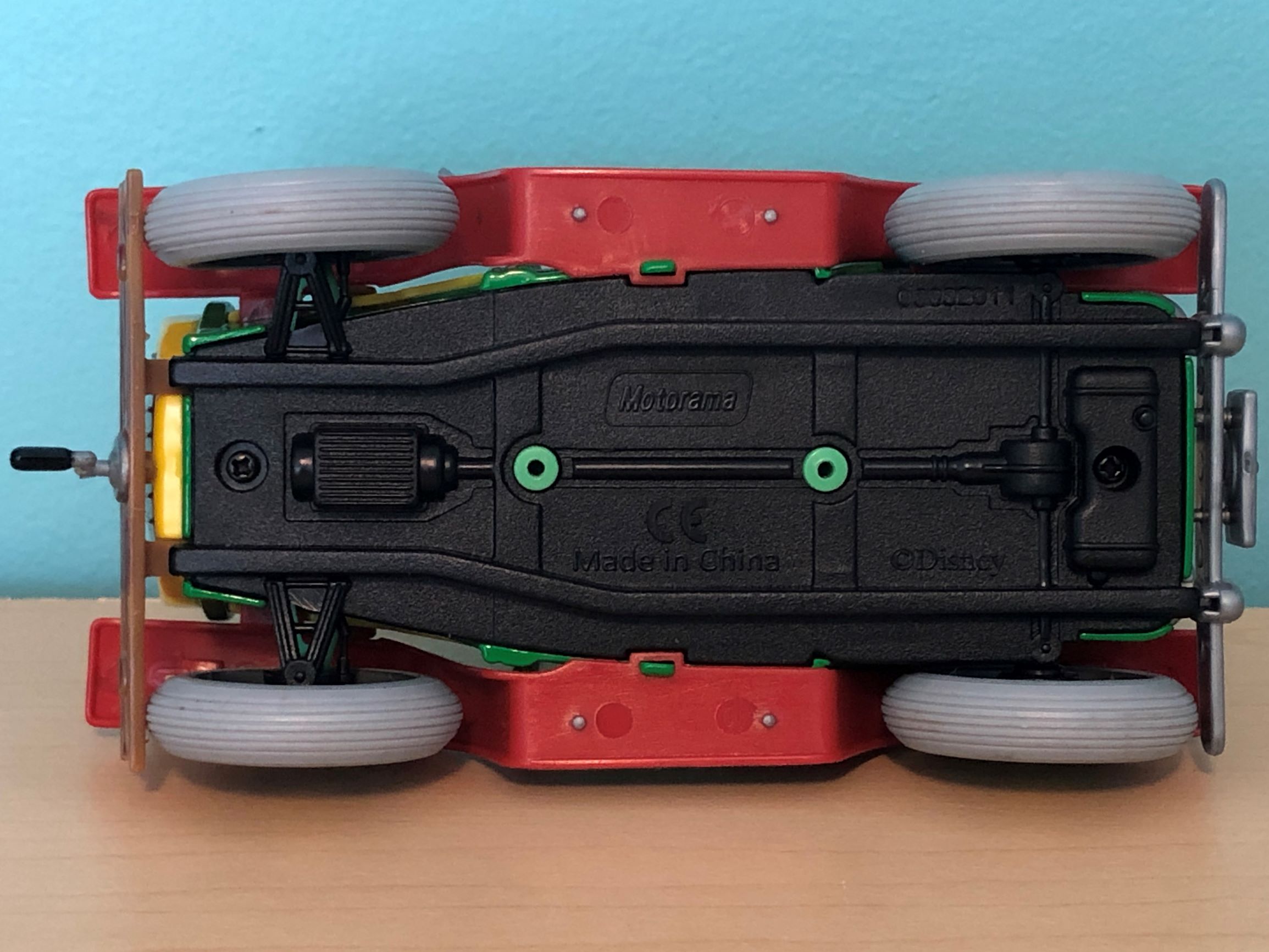 It’s nice to see such a thorough level of detail on the bottom of this toy. You can see the oil pan, drive shaft, and crank case along with the gas tank. You can also see the Disney trademark, that it was made in China, and that the manufacturer was Motorama.