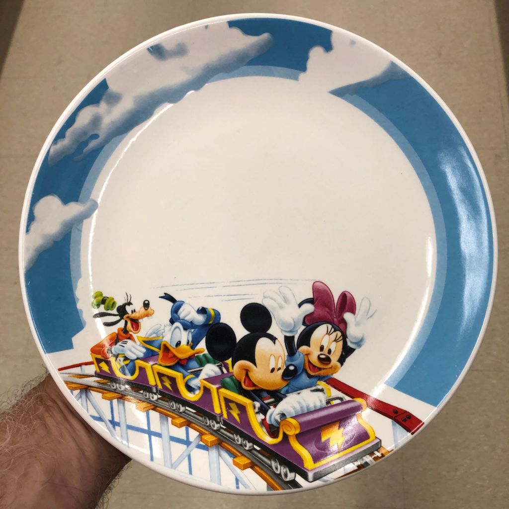 This was the plate I wanted the most, but you can see some wear on Minnie’s face, which got it placed back on the shelf. But what’s not to love about this image? Roller Coaster fun with four of our favorite Disney characters!