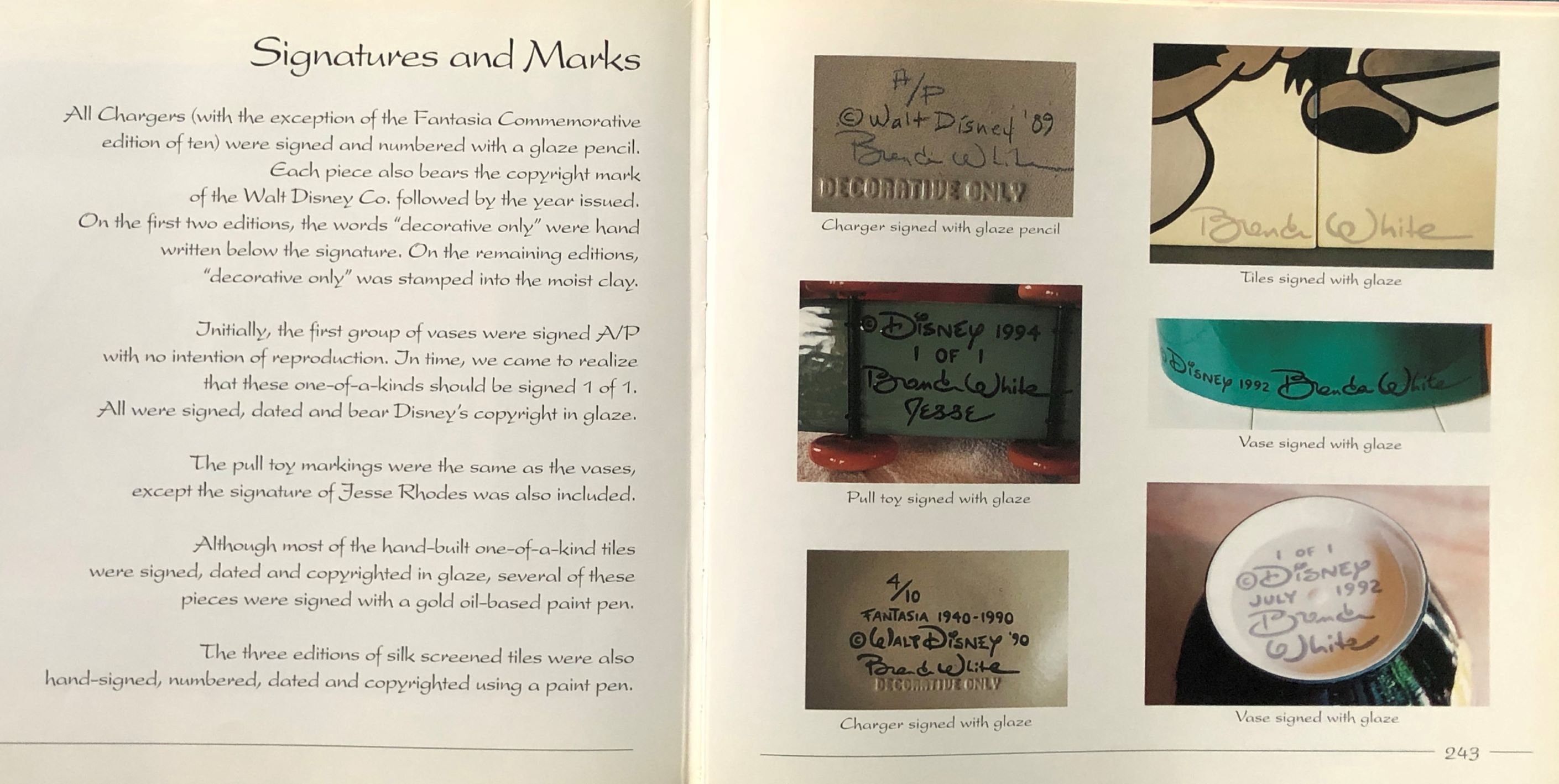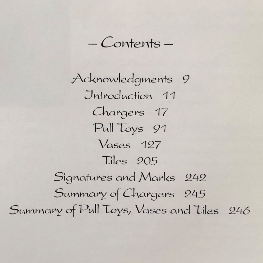 After some acknowledgments and a short introduction, the book is divided into four main sections: Chargers, Pull Toys, Vases, and Tiles. Then we have an informative two-page spread showing the various Signatures and Marks you will find on any art piece that has been produced, and finally, a full list of all products produced up to the date of the book.