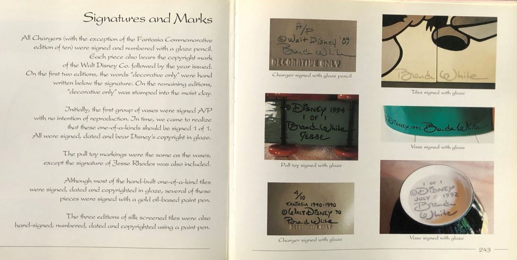 This book is a great reference for anyone who wishes to collect the work of Brenda White. How the artist signed each piece is specified in detail, making it possible to identify an authentic piece from a fake. You can see this in the image below: