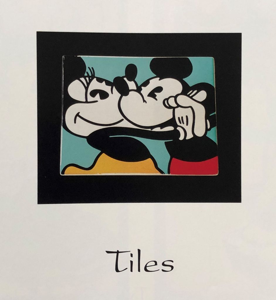 The examples of tiles are found singly, arranged in mosaics, or onto boxes. The mosaics are reminiscent of Mary Blair who did many tile installations for Walt Disney in the 50s and 60s.