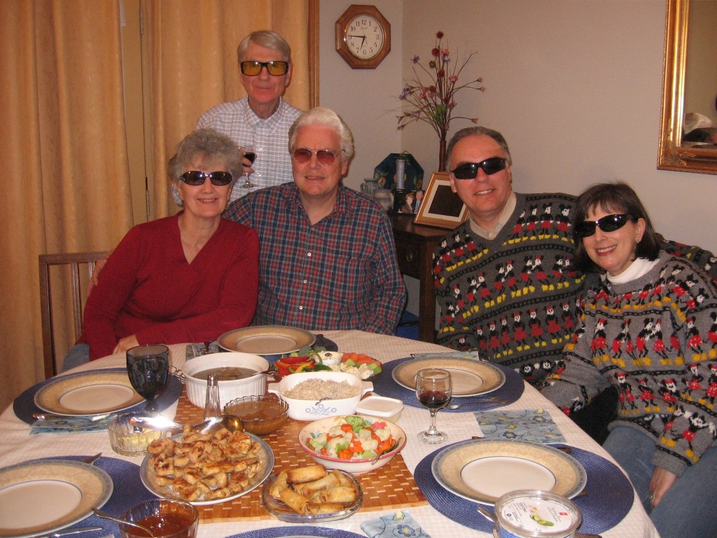 Years ago I had to undergo several delicate eye surgeries and stayed at a friends home to recover, as the hospital where I had the procedures done in was far from my own place of residence. One night my hosts invited some other of our friends over for a meal but my eye was still quite swollen and not looking very pretty to display. I wore sunglasses, and so did everyone else, to make me feel less conspicuous! That explains the picture below, but it is really included to show off our Disney-themed sweaters: