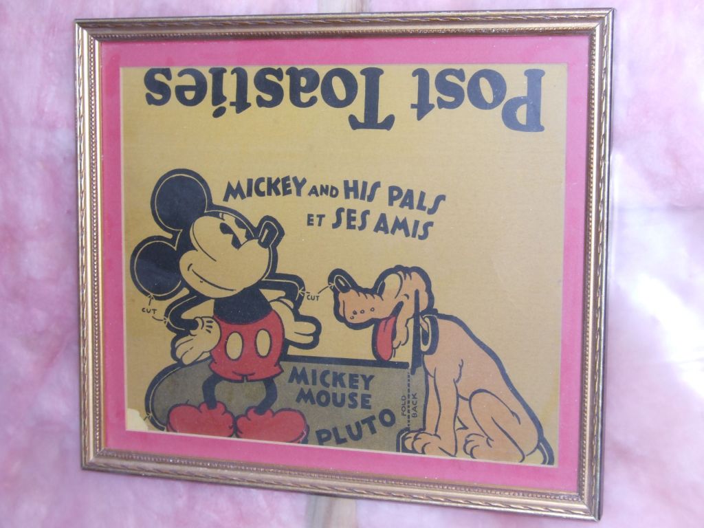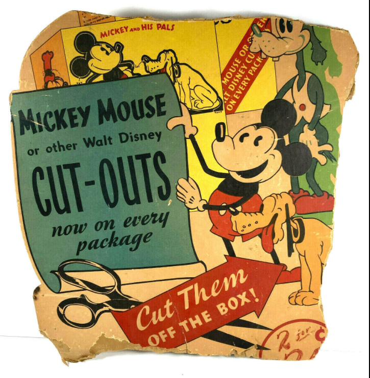 Stores would have displayed advertisements in or near the cereal isles to entice children. Having Mickey Mouse prominently pitching for Post Toasties would definitely have sold a few extra boxes! I’ve included an image of one such advertisement below: