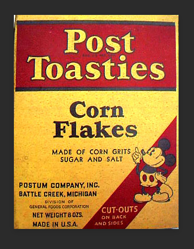 In 1935, Post Toasties became the first cereal to license the image of Micky Mouse for its packaging and advertisements. You can see one such pairing below: