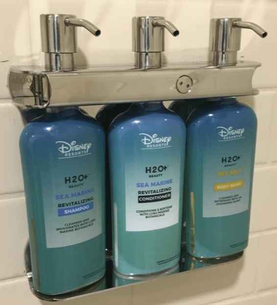 I’ve noticed that most Disney Resorts have done away with individual soaps and shampoos in favor of wall mounted dispensers: