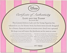 1955 saw the release of Disney’s 15th animated feature film, Lady and the Tramp. It was based on the original 1945 Cosmopolitan magazine story “Happy Dan, The Cynical Dog” by Ward Greene. 2012 saw the release of the Disney Store 25th Anniversary Lady and the Tramp Figurine Set. There were just 1955 of these sets produced to commemorate the date of the films original release.