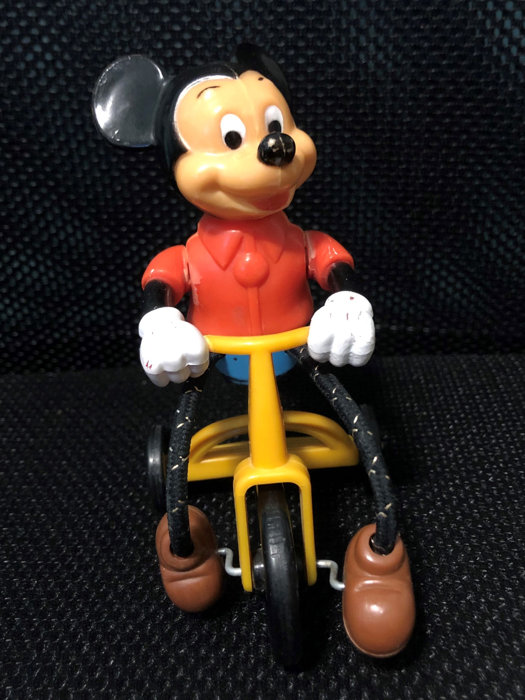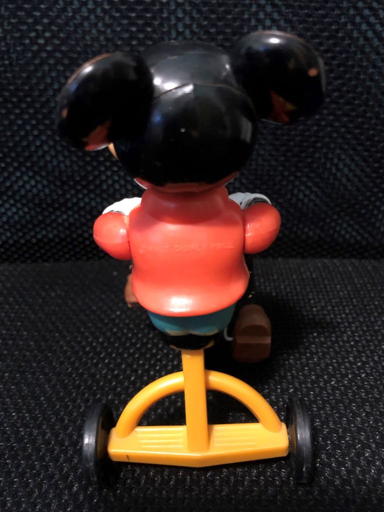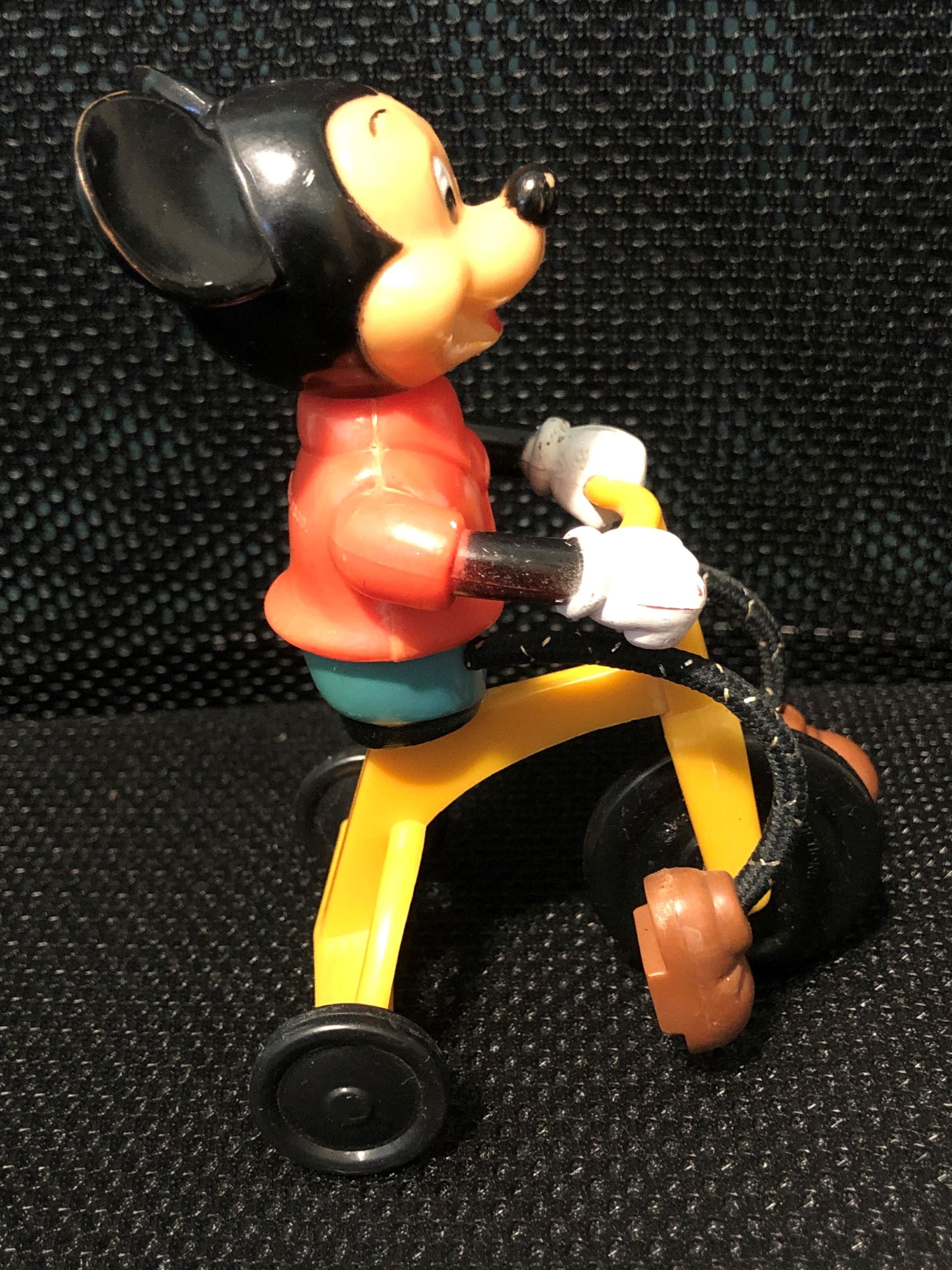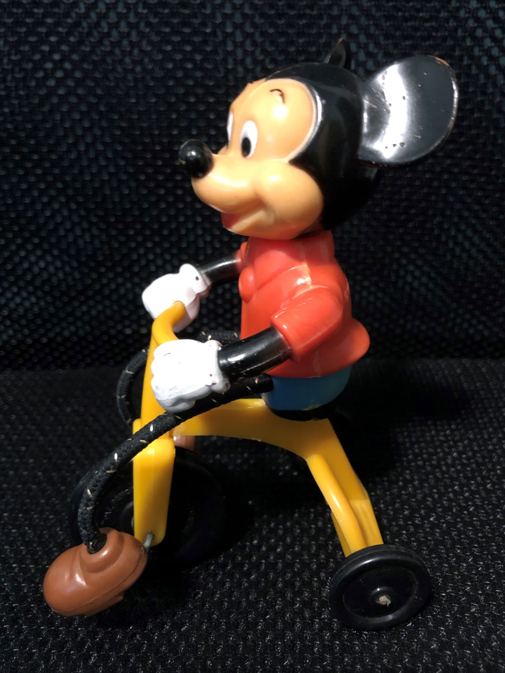 The main feature of the toy is that the wheels actually turn, and when the front one revolves, it moves Mickey’s legs to make it appear that he is peddling the tricycle.