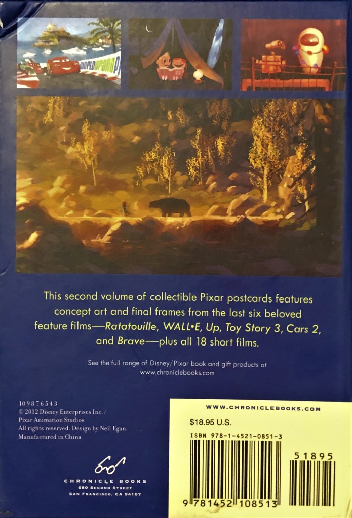 Briefly, I will add that these postcards contain concept art and final frames from six Pixar films and all 18 of the Shorts that had been released up to the time this box set was sold.