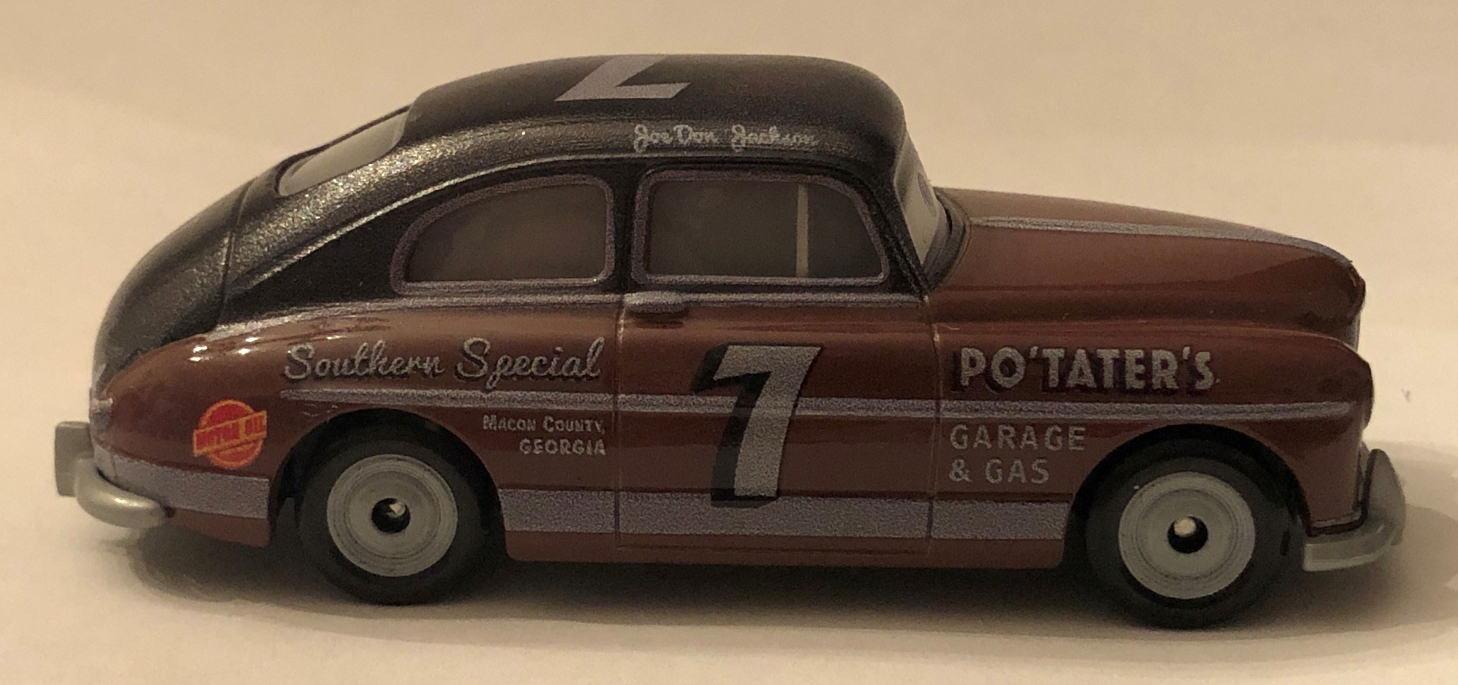 I like the name of the sponsor! A bit more of the history on that garage would be fun. I don’t buy every die cast model that comes out (who could?) but I focus on the unique ones. So when I see a character based on a vintage model of car, that’s when I pull out the old wallet.
