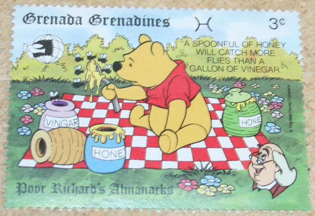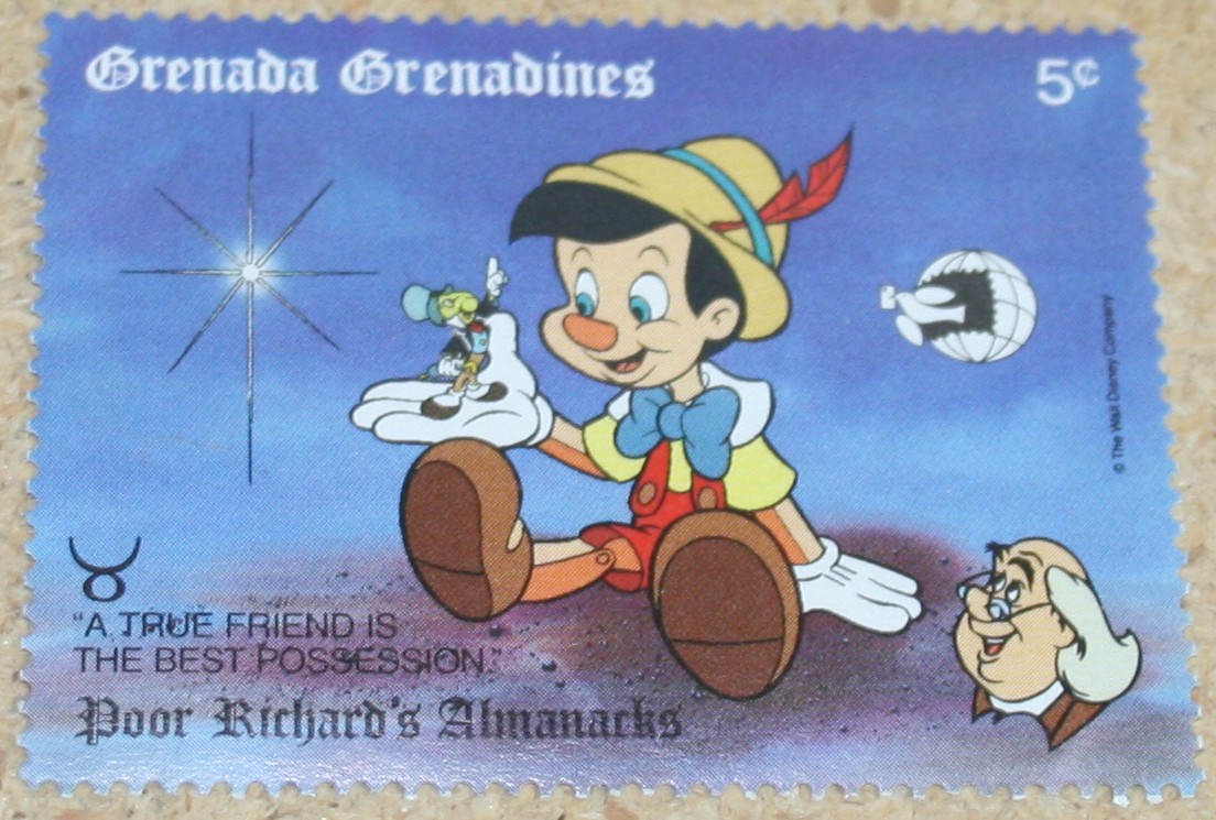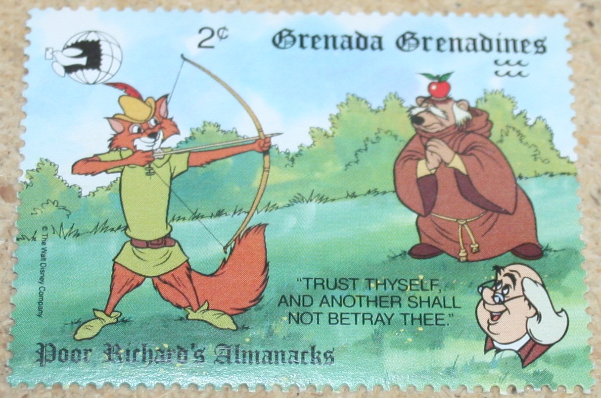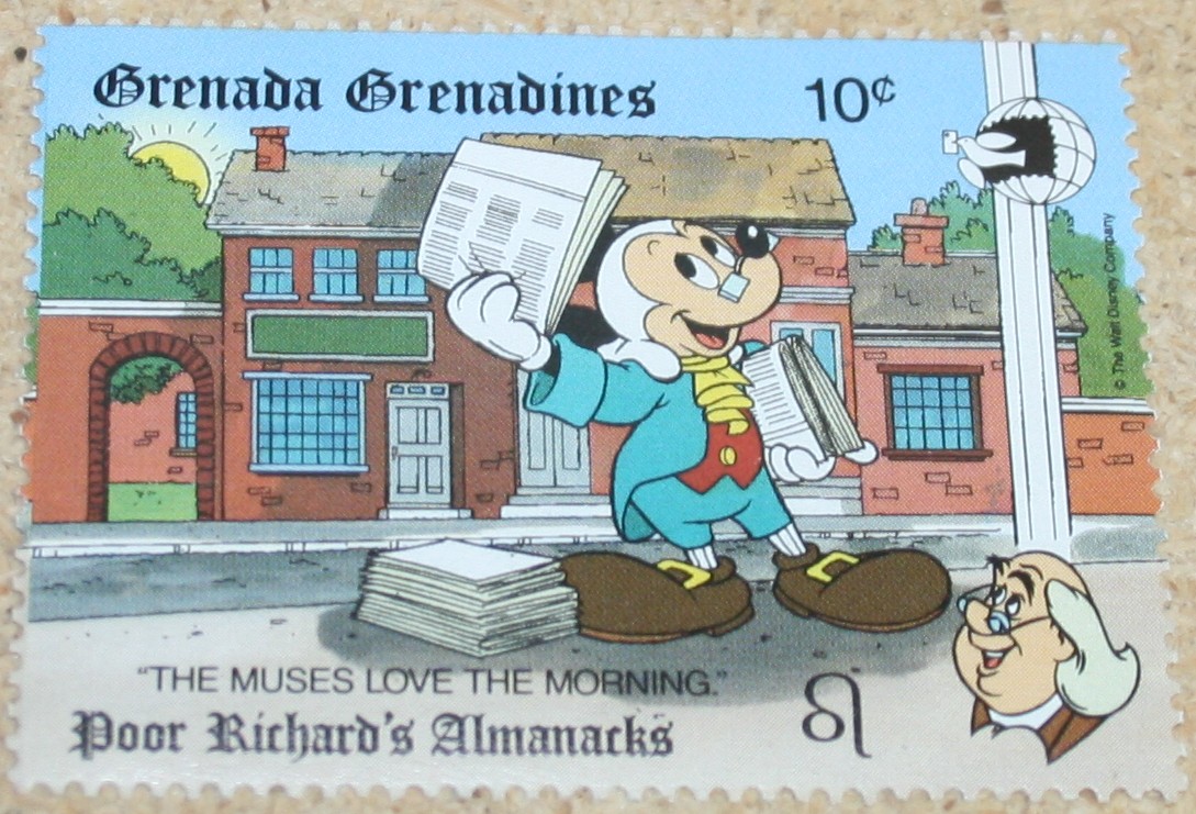 Benjamin Franklin published his almanack annually from 1732 to 1758. It included weather forecasts, household hints, puzzles, and other entertaining items. Disney characters are enlisted to act out some of the more famous sayings from the book on this set of stamps produced to mark the 1989 World Stamp Expo.