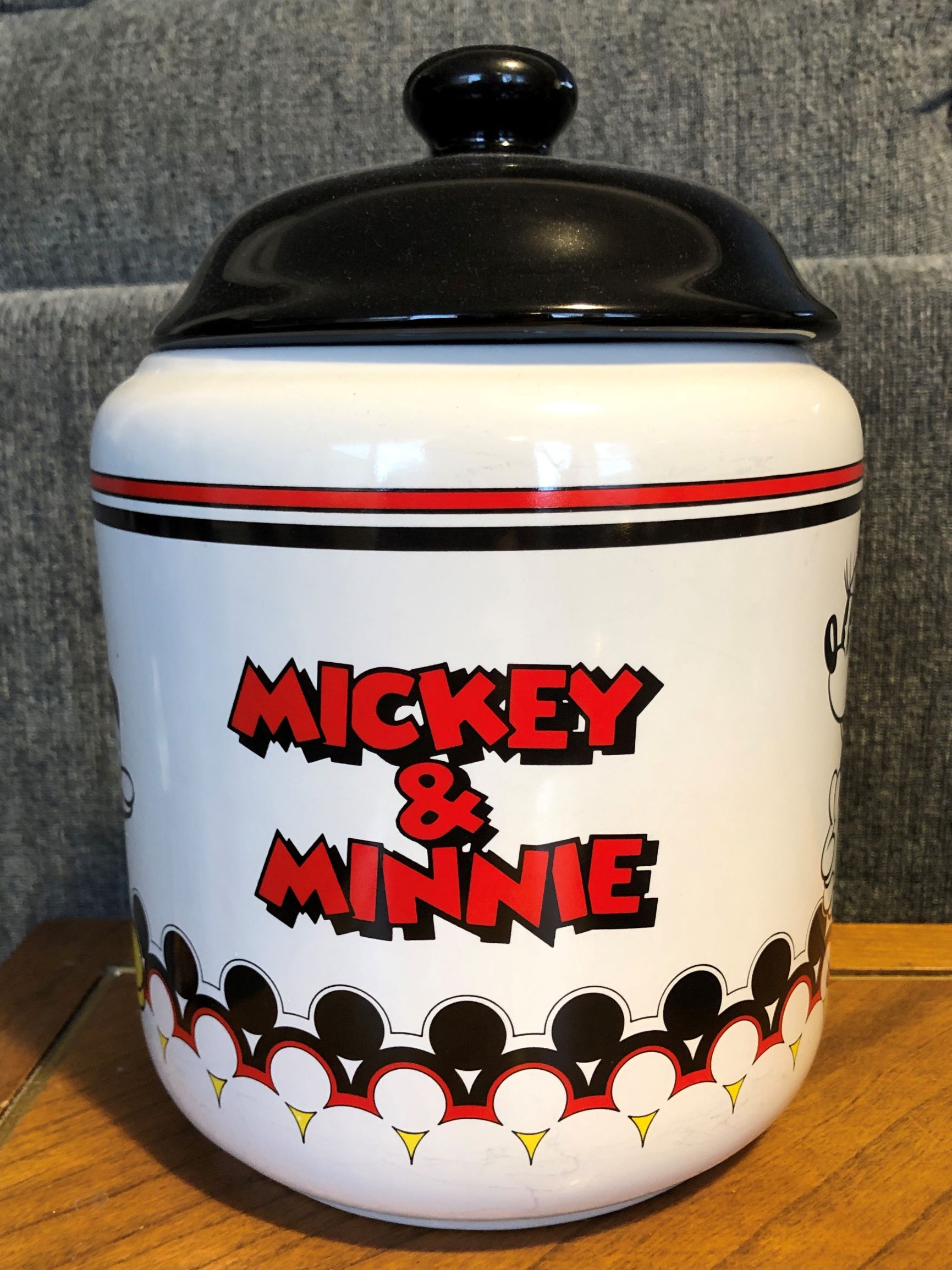 Nom Nom Nom! ‘M.I.C.’ may stand for ‘Mickey’ but ‘C’ has always stood for ‘Cookie’! And where better to store your favorite round snack than this Mickey and Minnie ceramic cookie jar: