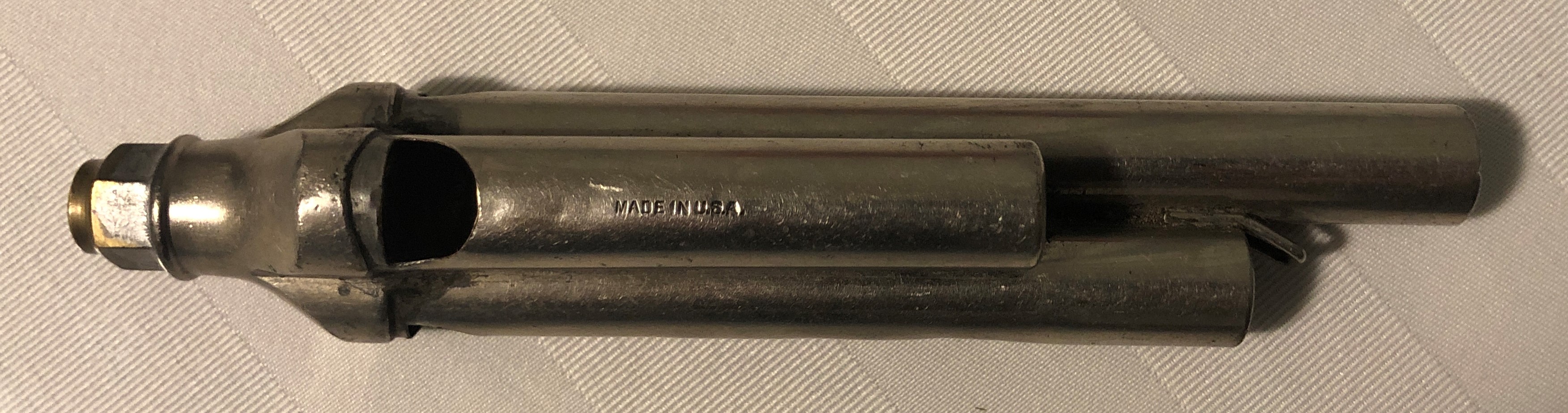 This whistle was custom made, adapted from steam-powered to air-powered (in other words, you now have to blow like crazy to get it to make a sound!) from a vintage Tapatco 3-chambered Conductor’s whistle. The audio clip (above) starts with the ‘All Aboard’ call and whistle, then a ‘Train Approaching’ whistle, a ‘Stop at Next Station’ whistle, and it concludes with a basic medley of whistle sounds.
