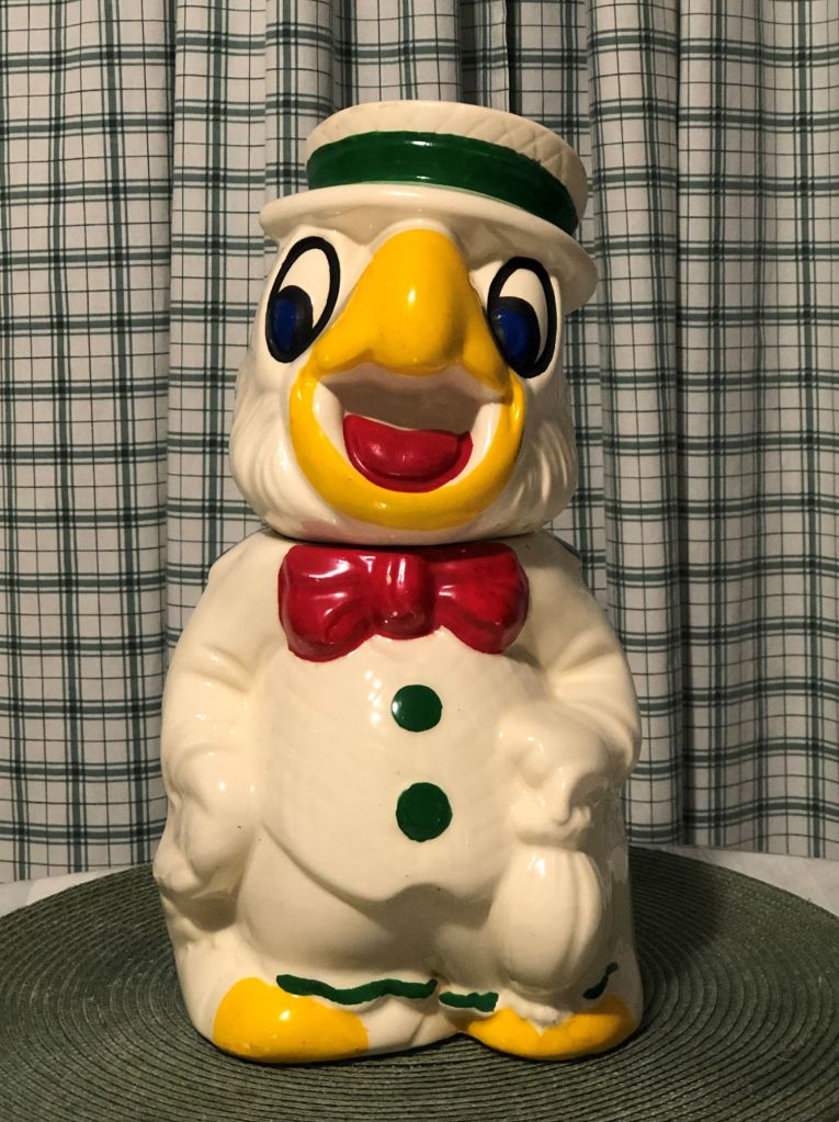 A local antique mall is going out of business early this year and to reduce stock is having a 50% off sale. I’ve bought many things from them over the years and they will be sorely missed! I stopped in the other day to check to see if there was anything I couldn’t live without, and wouldn’t you know it… there was. I found this wonderful Donald Duck / José Carioca reversible cookie jar.