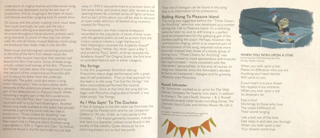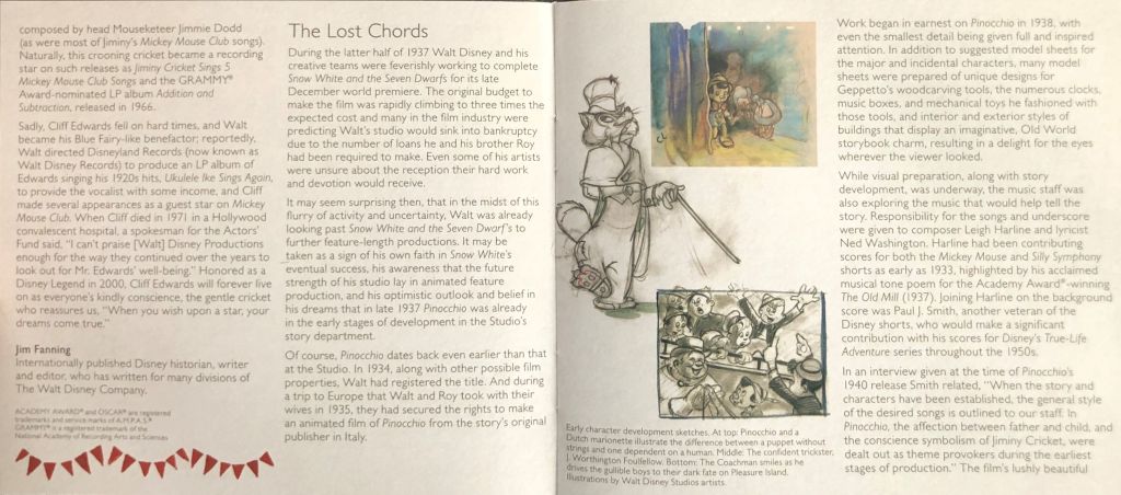 The history and gestation of the movie is given with interesting side notes about the character development, musical journey, and how the little cricket named Jiminy grew beyond the feature to co-star on The Mickey Mouse Club.