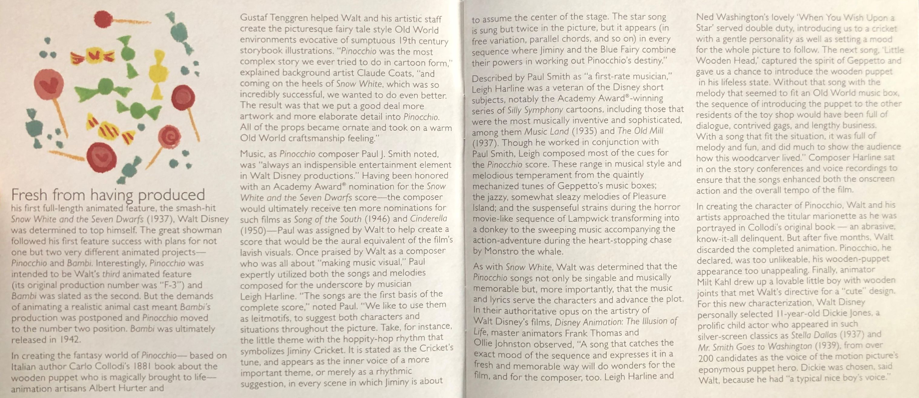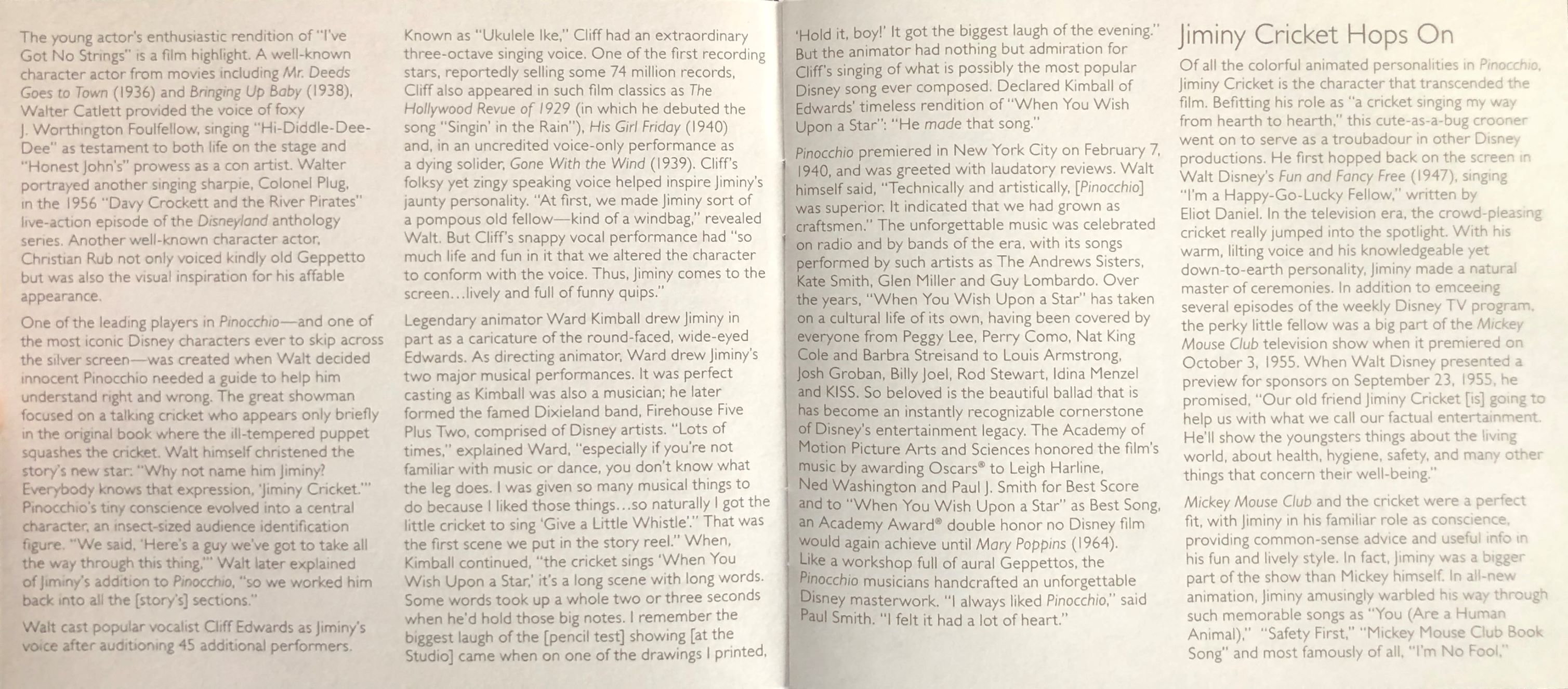 The history and gestation of the movie is given with interesting side notes about the character development, musical journey, and how the little cricket named Jiminy grew beyond the feature to co-star on The Mickey Mouse Club.