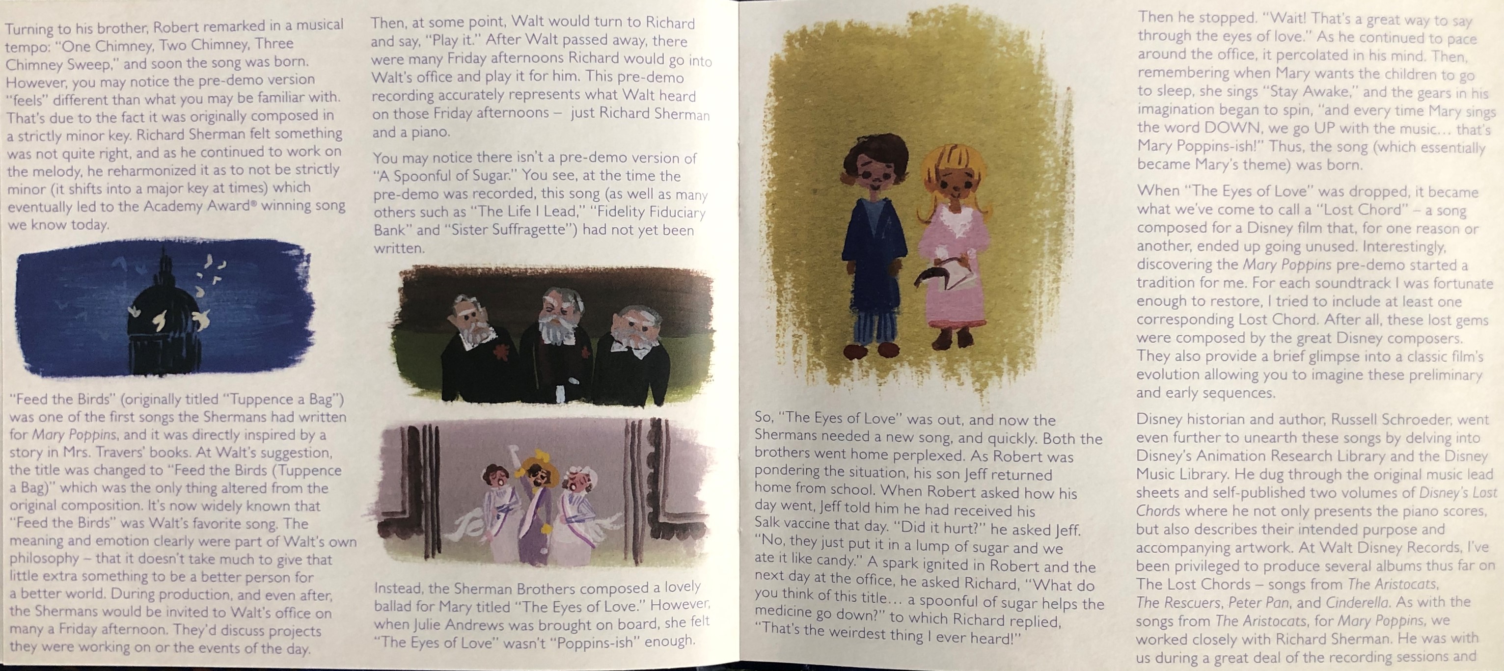 Mary Poppins is the second film to be featured and was released on August 26, 2014, to coincide with the 50th anniversary of Mary Poppins. The first disc contains the film’s complete original soundtrack, the second disc contains fifteen demo recordings by the Sherman Brothers and seven Lost Chords recordings. The third disc consists entirely of archival recordings of story meetings held at the Walt Disney Studios between P. L. Travers, Richard M. Sherman, Robert B. Sherman, and Don DaGradi, as well as press interviews with Julie Andrews, Dick Van Dyke, Irwin Kostal, and the Shermans.