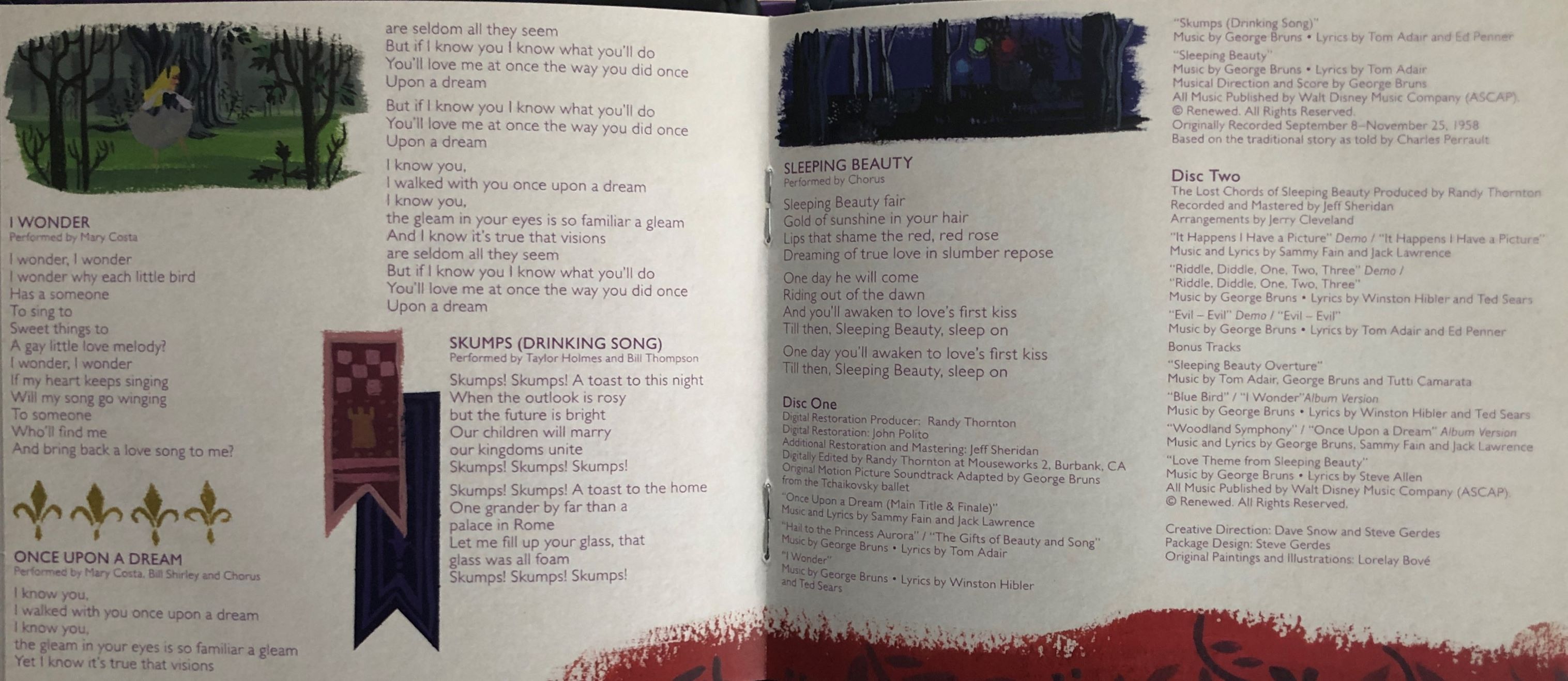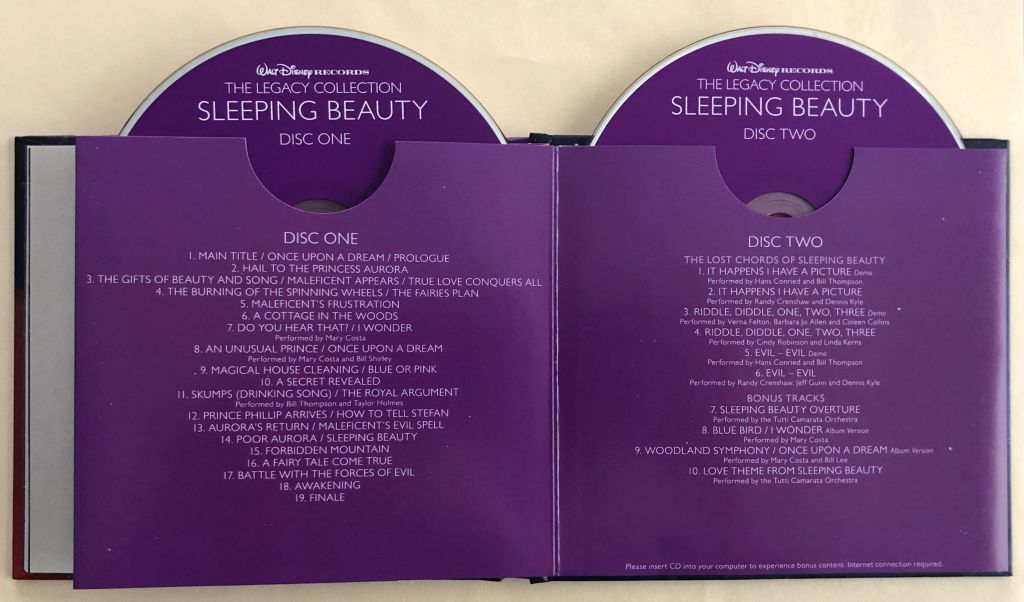 The Walt Disney version of Sleeping Beauty was released in 1959. The Legacy Collection Sleeping Beauty CD Set was the third to be released in the series and was available on October 7, 2014, to coincide with the 55th anniversary of Sleeping Beauty. The first disc contains the film’s complete original soundtrack and the second disc contains three demo recordings, three “Lost Chords” recordings, and four bonus tracks.