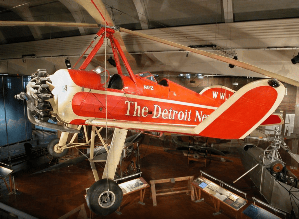 Actually, it appears to be something much cooler than a mere biplane! Instead, what we have pictured is a 1931 Pitcairn-Cierva Autogiro. Like an airplane, the autogiro is moved by an engine-powered propeller, but like a helicopter, lift is provided by a rotor. The rotor is not powered, and while the aircraft can land vertically, it cannot take off vertically. The Henry Ford Museum in Dearborn, MI. has a real one in its aviation collection!