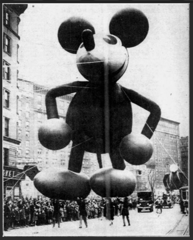 The Mickey Mouse balloon was 40 feet high, 26 feet wide, and contained 2,664 cubic feet of helium to make it float. 25 handlers were needed to guide it along the parade route.