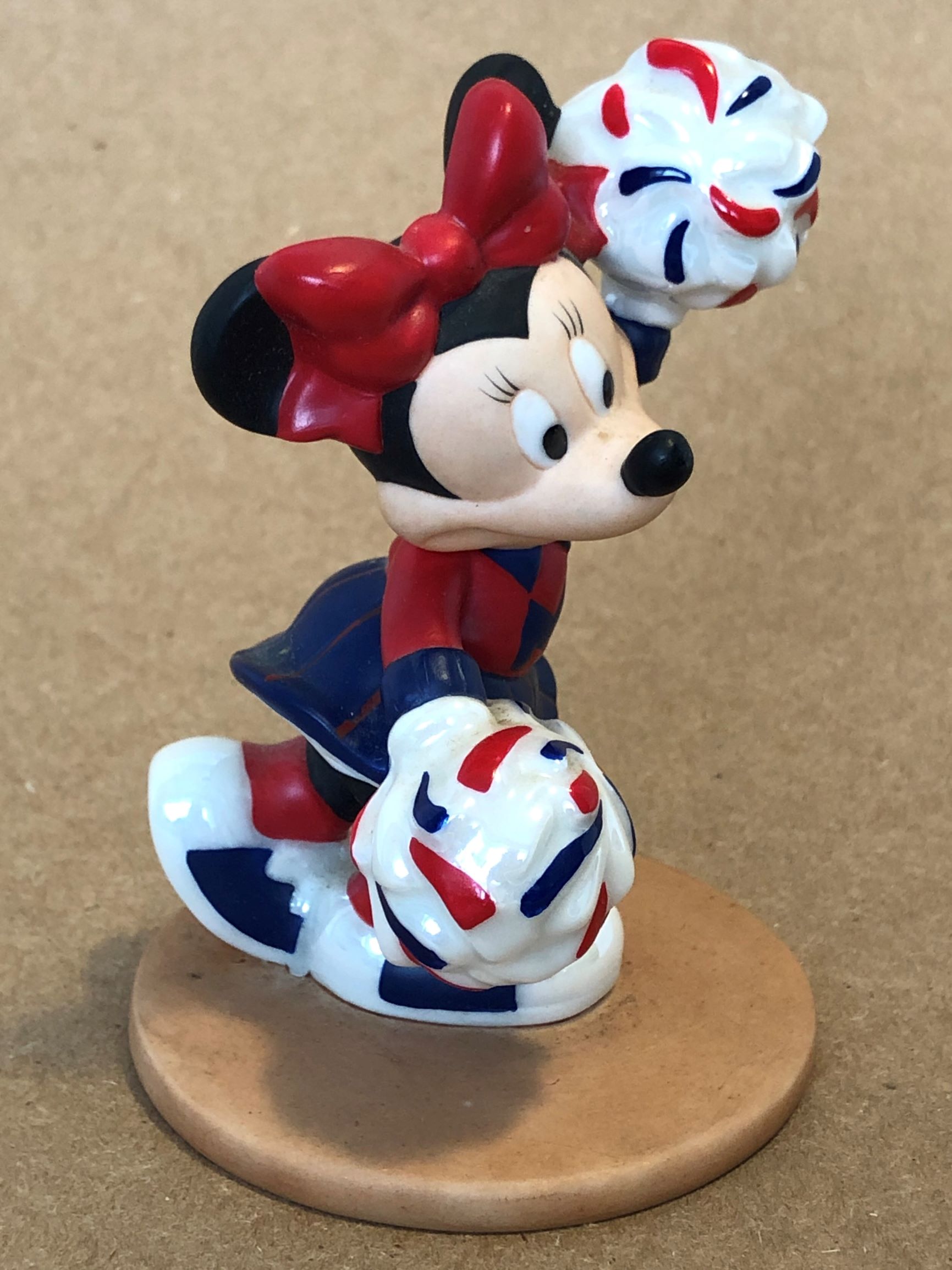 Cheerleading is a team activity in which elements of dance and acrobatics are combined with shouted slogans in order to entertain spectators at sporting events and to encourage louder and more enthusiastic cheering from the crowds. This cheerleader Minnie Mouse ceramic figurine certainly captures the energy and fun of this sport: