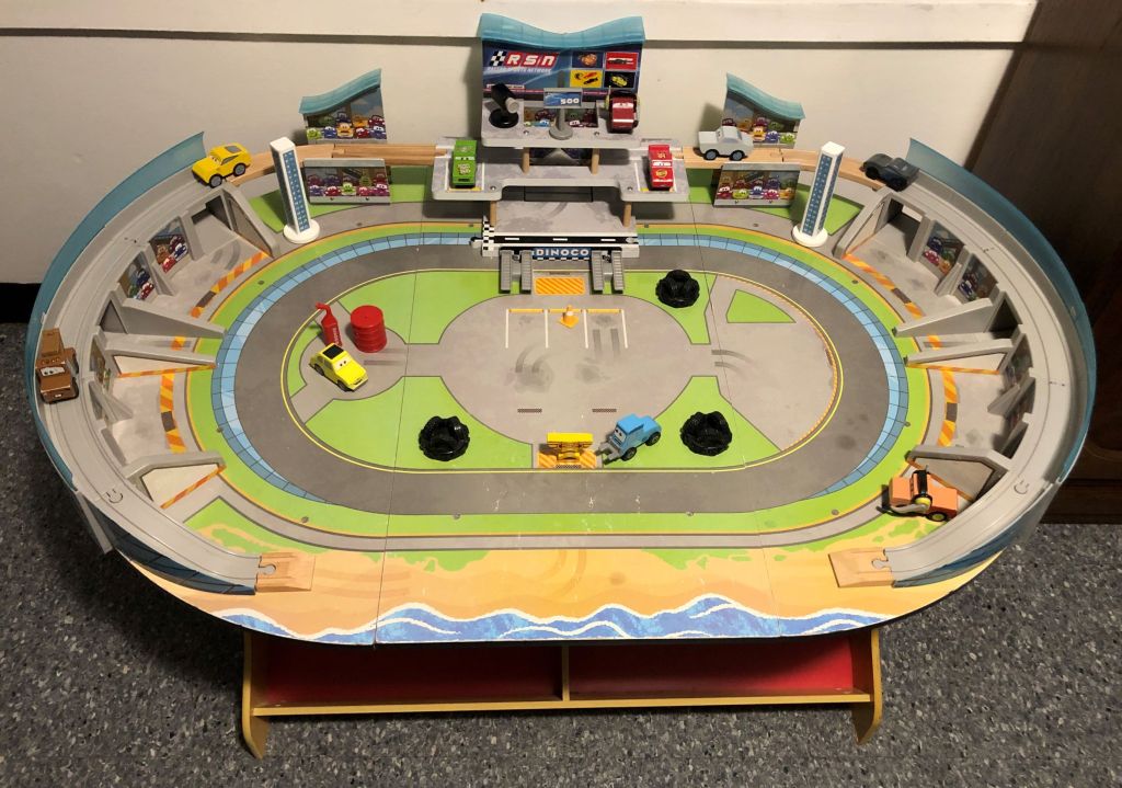 So I set up the table with the parts I could use. Now, it actually turned out to be a blessing that pieces were missing, because it left more room for my die cast collection of Cars characters. So no harm, no foul. I guess we won’t need the black flag with the orange circle after all!