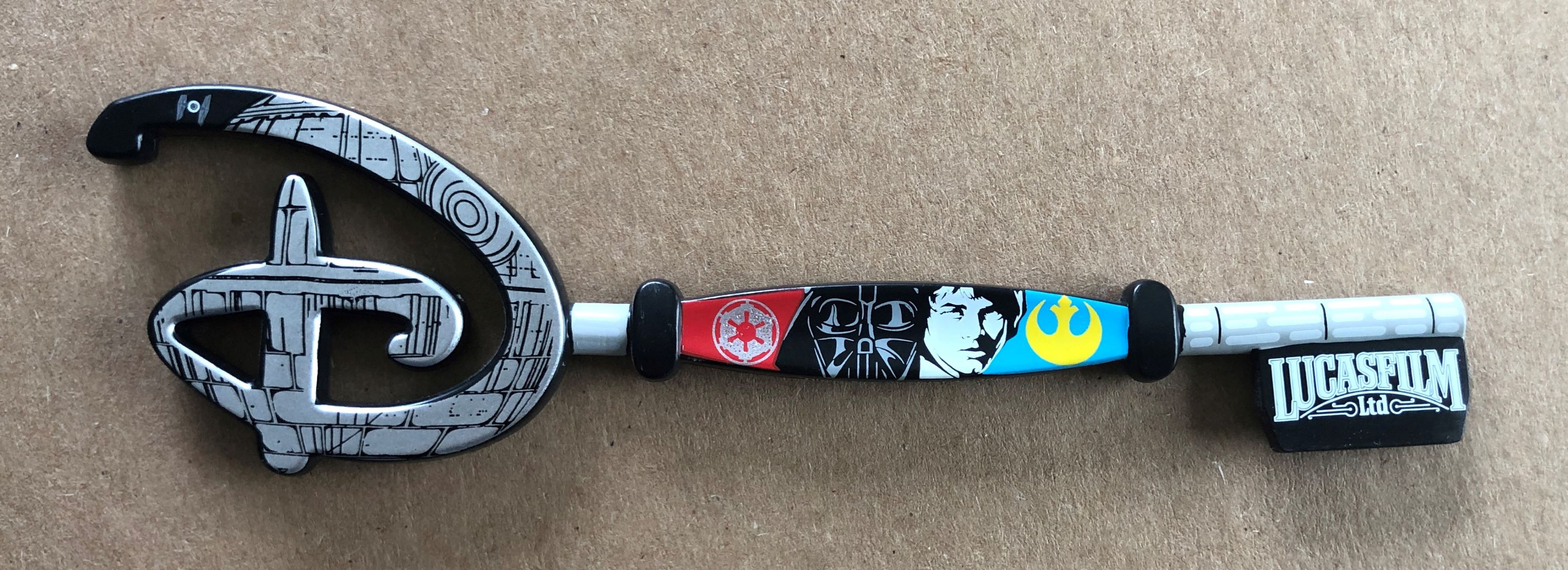 DESIGN CUES: The Disney ‘D’ is emblazoned with a close-up view of the Death Star complete with a tiny TIE Fighter. The shaft has images of the iconic emblems of the Empire and the Rebel Alliance along with the faces of Darth Vader and Luke Skywalker. A nice father/son spotlight! The teeth of the key is the division name on a square block.