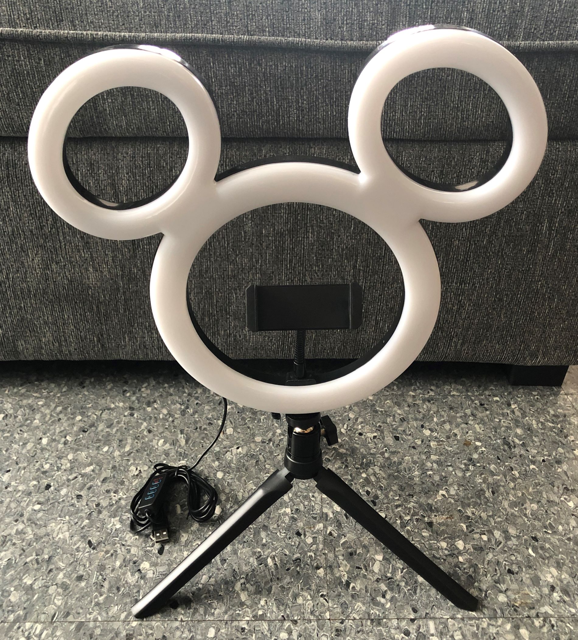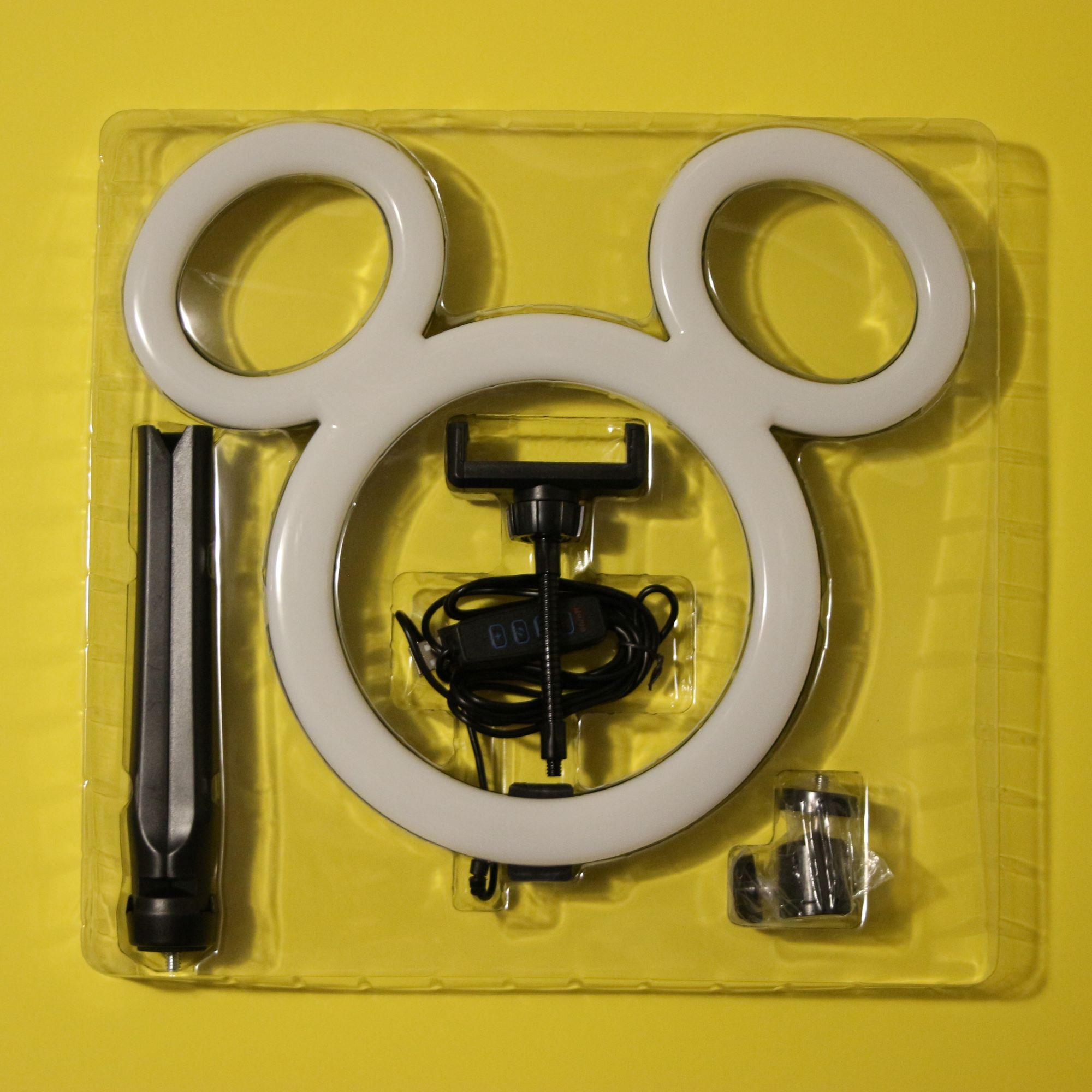 My larger generic version came with a remote control that will link to your Smartphone, which sits in the holder at the center of Mickey’s ‘head’, through Bluetooth. This makes it possible to operate the camera and video functions from a distance. I can use it with this smaller ring light as well, as it doesn’t link to the light itself.