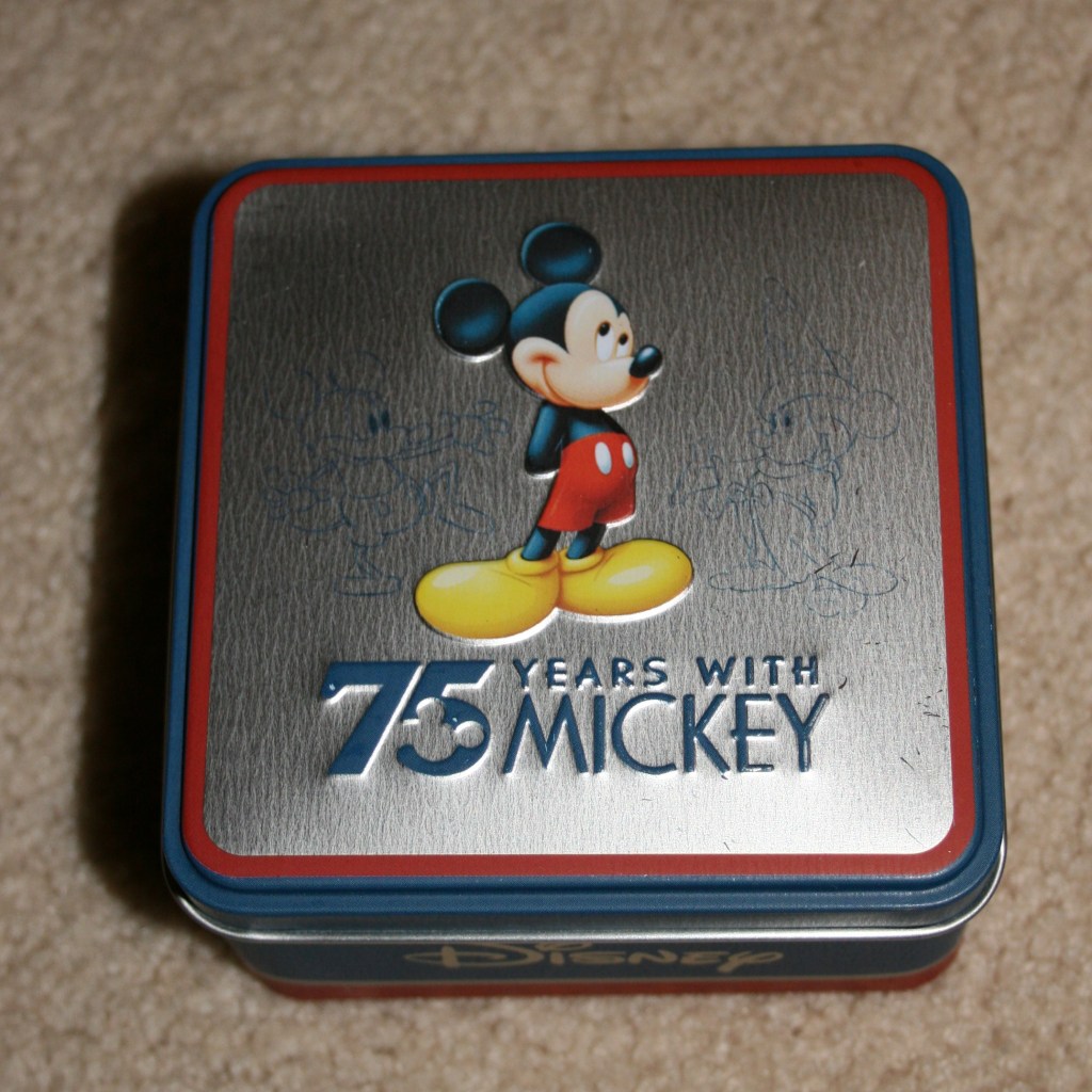 This souvenir tin came with the release of a watch that commemorated the 75th anniversary of Mickey Mouse (2003). I like the line images of Mickey in the background.