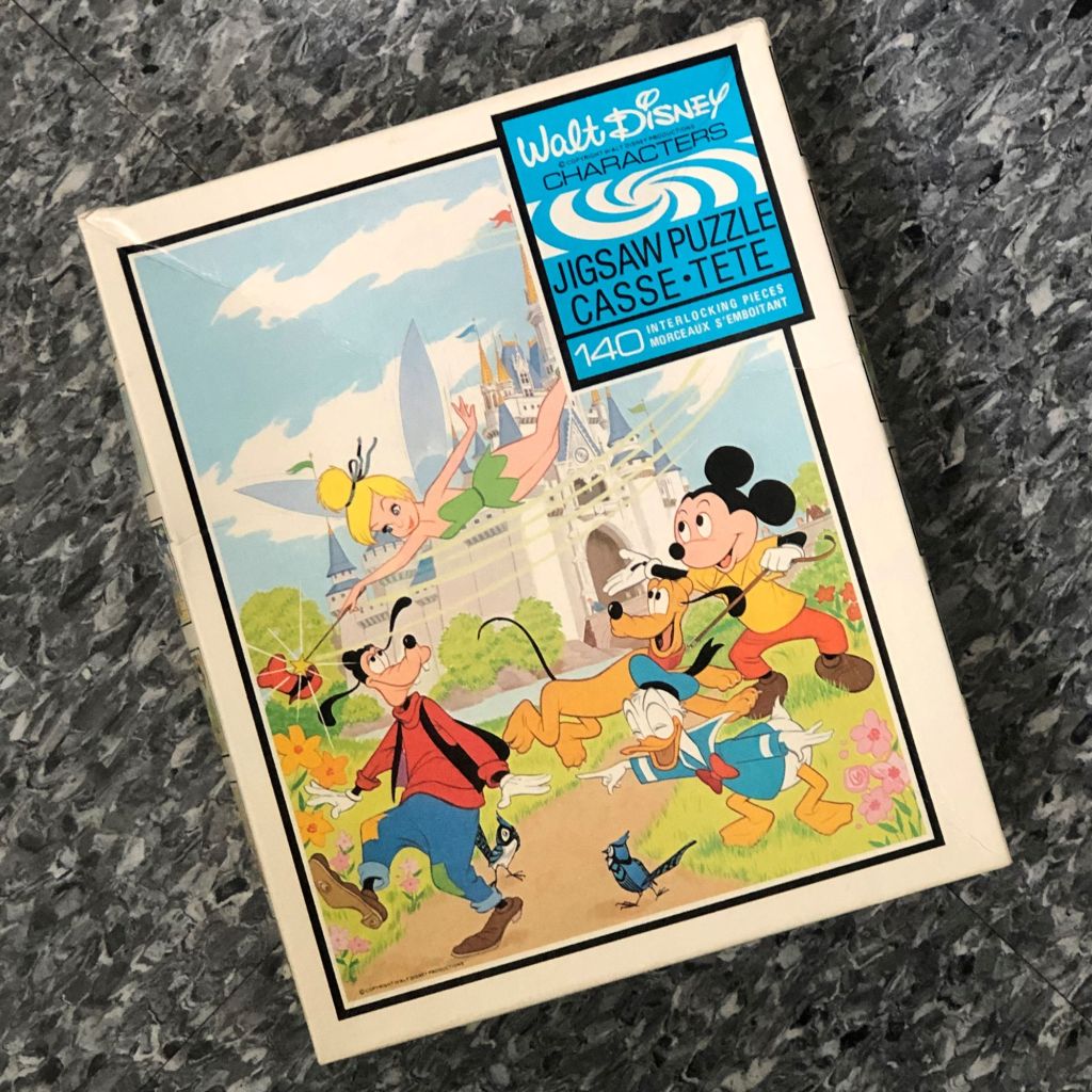 Vintage puzzles are amazing! The artwork and design on the boxes are usually enough to get me to buy them, let alone what is to be found inside. But this Walt Disney Characters Disneyland puzzle by PARKER will not be assembled any time soon. More on that later.
